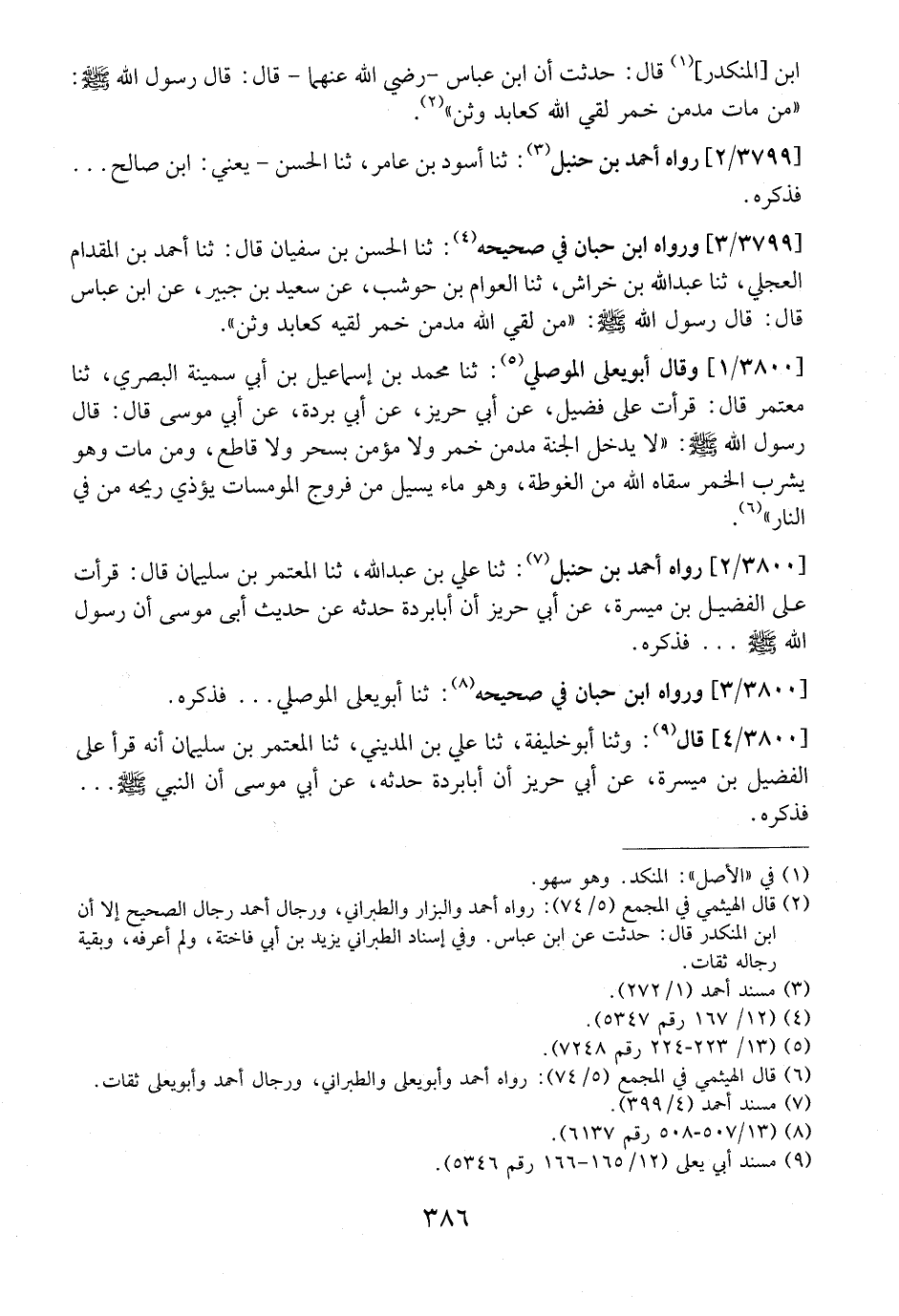 3800 / 1 - وَقَالَ أَبُو يَعْلَى الْمَوْصِلِيُّ: ثَنَا مُحَمَّدُ بْنُ إِسْمَاعِيلَ بْنِ أَبِي سمينة البصري ثنا معتمرقال: قرأت على فضيل، عن أبي حر يز، عَنْ أَبِي بُرْدَةَ، عَنْ أَبِي مُوسَى قَالَ: قَالَ رَسُولُ اللَّهِ- صَلَّى اللَّهُ عَلَيْهِ وَسَلَّمَ -: لَا يَدْخُلُ الْجَنَّةَ مُدْمِنُ خَمْرٍ وَلَا مُؤْمِنٌ بِسِحْرٍ وَلَا قَاطِعٌ، وَمَنْ مَاتَ وَهُوَ يَشْرَبُ الخمرسقاه الله من الغوطة، وهو دواء يسيل من فروج المومسات يوذي رِيحُهُ مَنْ فِي النَّارِ".