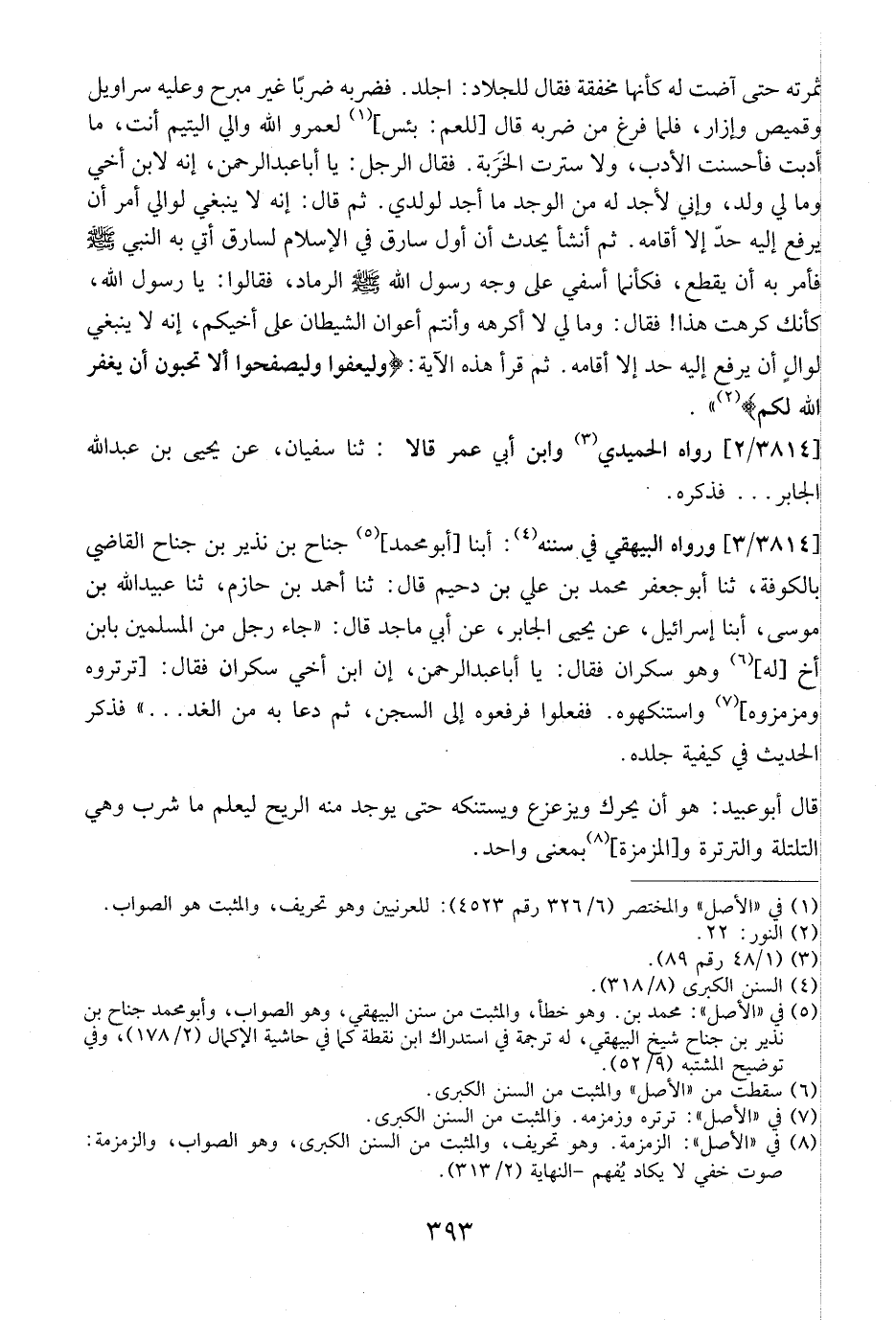 3814 / 3 - وَرَوَاهُ البيهقي في سننه: أبنا أبو محمد، جُنَاحِ بْنِ نَذِيرِ بْنِ جُنَاحٍ الْقَاضِي بِالْكُوفَةِ ثَنَا أَبُو جَعْفَرٍ مُحَمَّدُ بْنُ عَلِيِّ بْنُ دُحَيْمٍ قَالَ: ثنا أَحْمَدُ بْنُ حَازِمٍ، ثنا عبيد الله بن موسى، أبنا إسرائل، عن يحيى الجابرعن أَبِي مَاجِدٍ قَالَ: "جَاءَ رَجُلٌ مِنَ الْمُسْلِمِينَ بابن أخ له وهو سكران فقال: يا آباعبد الر حمن، إن ابن أخي سكران فقال: ترتروه ومزمزوه، واستنكهوه. ففعلوا فرفعوه إِلَى السِّجْنِ، ثُمَّ دَعَا بِهِ مِنَ الْغَدِ ... فذكر الحديث في كيفية جلده.