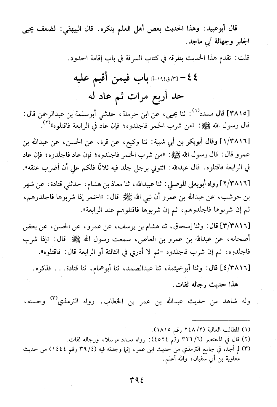 3815 - قَالَ مُسَدَّدٌ: ثنا يجيى، عَنِ ابْنِ حَرْمَلَةَ، حَدَّثَنِي أَبُو سَلَمَةَ بْنُ عَبْدِ الرَّحْمَنِ قَالَ: قَالَ رَسُولُ اللَّهِ - صَلَّى اللَّهُ عَلَيْهِ وَسَلَّمَ -: مَنْ شَرِبَ الْخَمْرَ فَاجْلِدُوهُ فإن عادفي الرَّابِعَةِ فَاقْتُلُوهُ ".