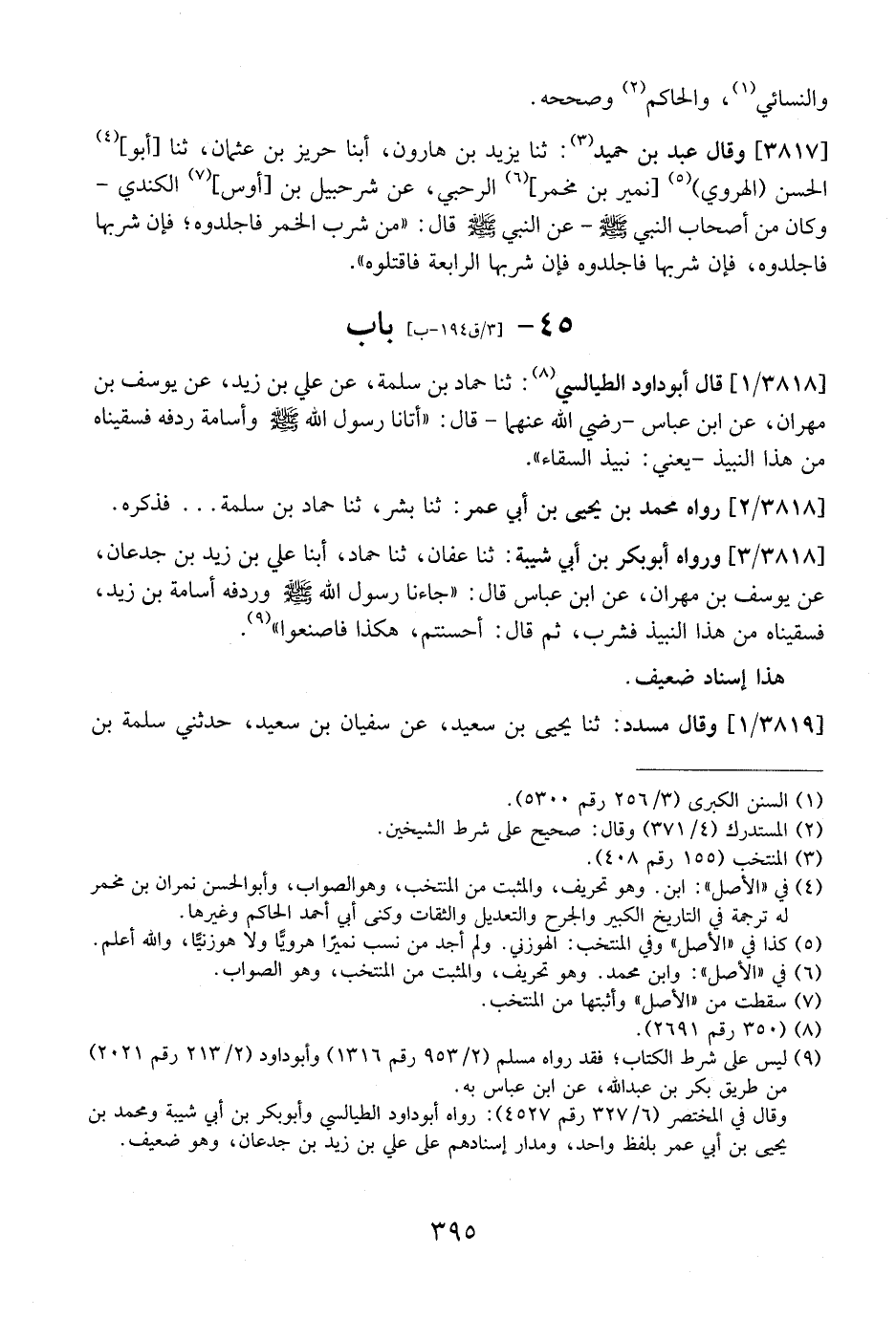 3818 / 1 - قَالَ أَبُو دَاوُدَ الطَّيَالِسِيُّ: ثَنَا حَمَّادُ بْنُ سَلَمَةَ عَنْ عَلِيِّ بْنِ زَيْدٍ، عَنْ يُوسُفَ بْنِ مِهْرَانَ، عَنِ ابْنِ عَبَّاسٍ- رَضِيَ اللَّهُ عَنْهُمَا- قَالَ: "أَتَانَا رَسُولُ اللَّهِ - صَلَّى اللَّهُ عَلَيْهِ وَسَلَّمَ - وَأُسَامَةُ رِدْفُهُ فَسَقَيْنَاهُ من هذا النبيذ- يعني: نبيذ السقاء".