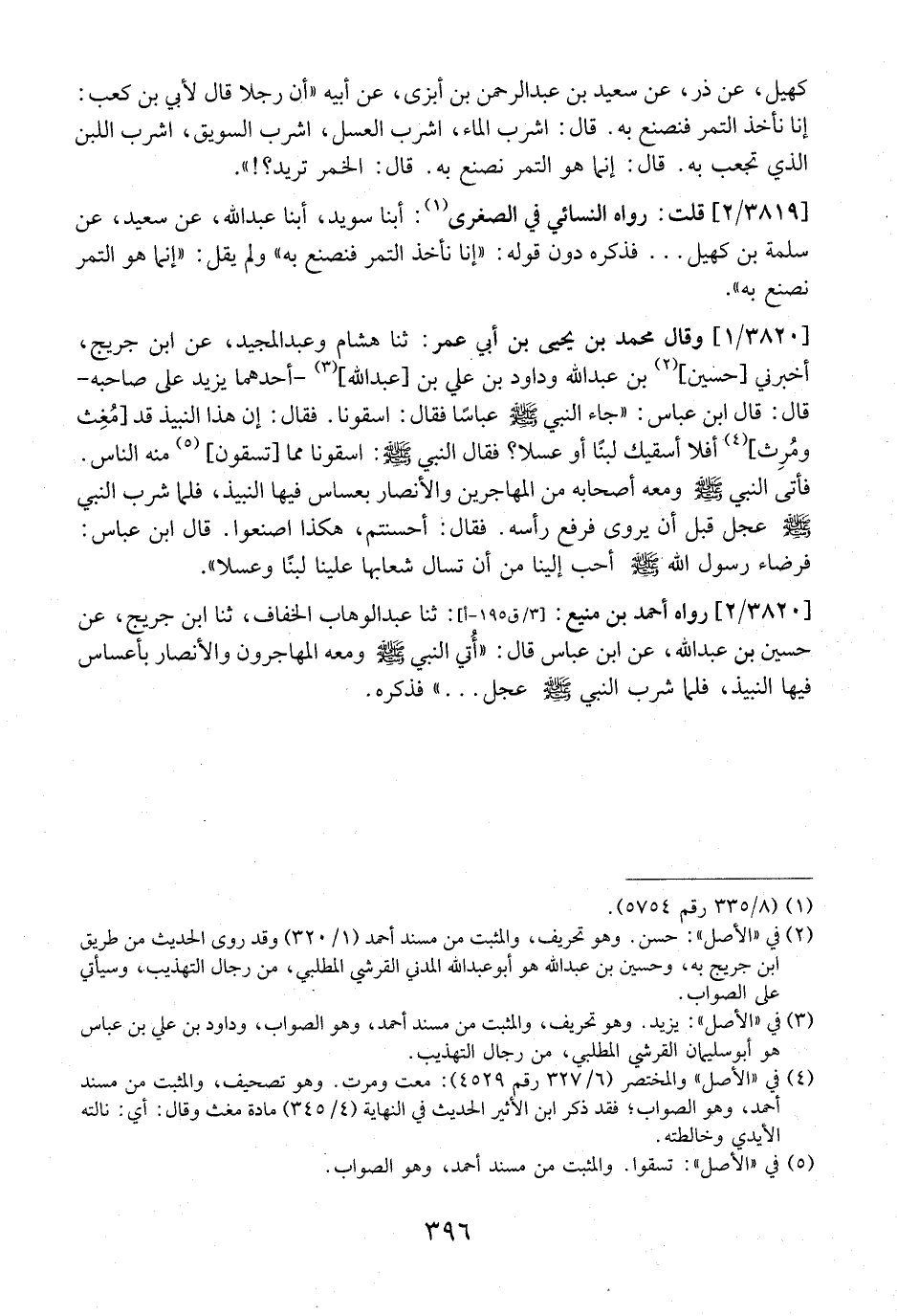 3820 / 1 - وقال محمد بن يحى بْنِ أَبِي عُمَرَ: ثنا هِشَامٌ وَعَبْدُ الْمَجِيدِ، عن ابن جريج، أخبرني حسين بن عبد الله ودارد بن علي بن عبد الله، - أَحَدُهَمَا يَزِيدُ عَلَى صَاحِبِهِ- قَالَ: قَالَ ابْنُ عَبَّاسٍ: "جَاءَ النَّبِيُّ - صَلَّى اللَّهُ عَلَيْهِ وَسَلَّمَ -عَبَّاسًا فَقَالَ: اسْقُونَا. فَقَالَ: إِنَّ هَذَا النَّبِيذَ قد مُغِث ومُرِث، أَفَلَا أَسْقِيكَ لَبَنًا، أَوْ عَسَلًا فَقَالَ النَّبِيُّ- صلى الله عليه وسلم -: اسقونا مما تسقون، مِنْهُ النَّاسَ. فَأَتَى النَّبِيَّ - صَلَّى اللَّهُ عَلَيْهِ وَسَلَّمَ -وَمَعَهُ أَصْحَابُهُ مِنَ الْمُهَاجِرِينَ وَالْأَنْصَارِ بِعُسَاسٍ فِيهَا النَّبِيذُ، فَلَمَّا شَرِبَ النَّبِيُّ صَلَّى اللَّهُ عَلَيْهِ وَسَلَّمَ عَجَّلَ قَبْلَ أَنْ يُرْوَى فَرَفَعَ رَأْسَهُ، فَقَالَ: أَحْسَنْتُمْ، هَكَذَا اصْنَعُوا، قَالَ ابْنُ عَبَّاسٍ: فَرِضَاءُ رَسُولِ اللَّهِ صَلَّى اللَّهُ عَلَيْهِ وَسَلَّمَ أَحَبُّ إِلَيْنَا مِنْ أَنْ تَسْأَلَ شِعَابُهَا عَلَيْنَا لَبَنًا وَعَسَلاً.