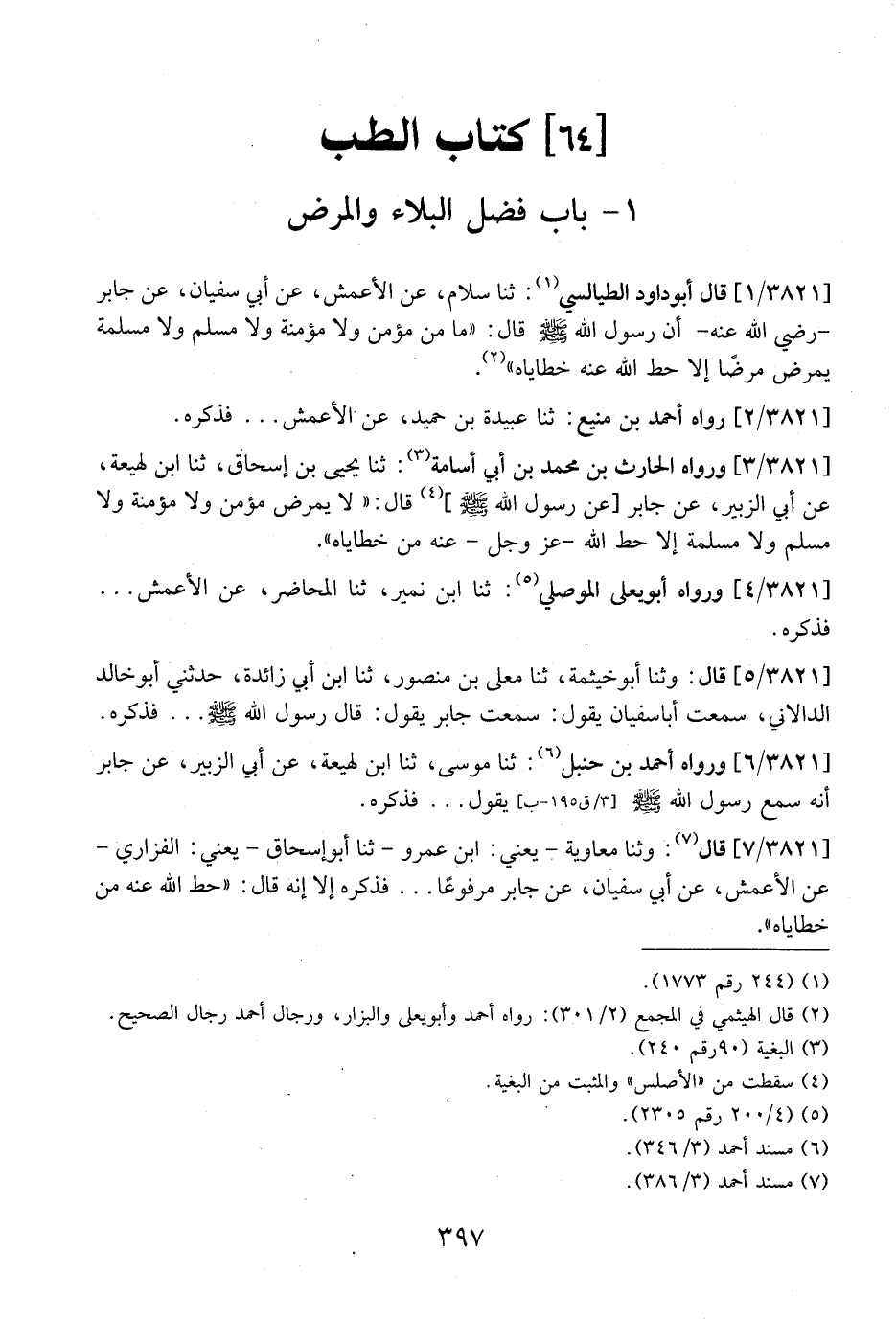 3821 / 7 - قَالَ: وثنا مُعَاوِيَةُ -يَعْنِي: ابْنَ عَمْرٍو- ثنا أَبُو إِسْحَاقَ -يَعْنِي: الْفَزَارِيَّ- عَنِ الْأَعْمَشِ، عَنْ أَبِي سُفْيَانَ، عَنْ جَابِرٍ مَرْفُوعًا ... فَذَكَرَهُ إِلَّا أَنَّهُ قَالَ: "حَطَّ اللَّهُ عَنْهُ من خطاياه".