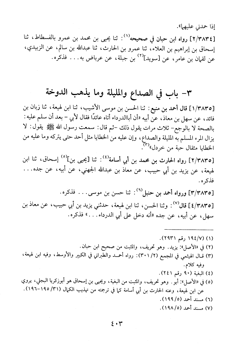 3835 / 1 - قَالَ أَحْمَدُ بْنُ مَنِيعٍ: ثَنَا الْحَسَنُ بْنُ مُوسَى الْأَشْيَبُ، ثَنَا ابْنُ لَهِيعَةَ، ثَنَا زَبَّانُ بْنُ فَائِدٍ، عَنْ سَهْلِ بْنِ مُعَاذٍ، عَنْ أَبِيهِ "أَنَّ أَبَا الدَّرْدَاءِ أَتَاهُ عَائِدًا فَقَالَ لِأَبِي - بَعْدَ أَنْ سَلَّمَ عَلَيْهِ: بِالصِّحَّةِ لَا بِالْوَجَعِ -ثَلَاثَ مَرَّاتٍ يَقُولُ ذَلِكَ- ثُمَّ قَالَ: سَمِعْتُ رَسُولَ اللَّهِ - صَلَّى اللَّهُ عَلَيْهِ وَسَلَّمَ - يَقُولُ: لَا يَزَالُ الْمَرْءُ الْمُسْلِمُ بِهِ الْمَلِيلَةُ وَالصُّدَاعُ، وَإِنَّ عَلَيْهِ مِنَ الْخَطَايَا مِثْلَ أحد حتى يتركه وَمَا عَلَيْهِ مِنَ الْخَطَايَا مِثْقَالُ حَبَّةٍ مِنْ خَرْدَلٍ".