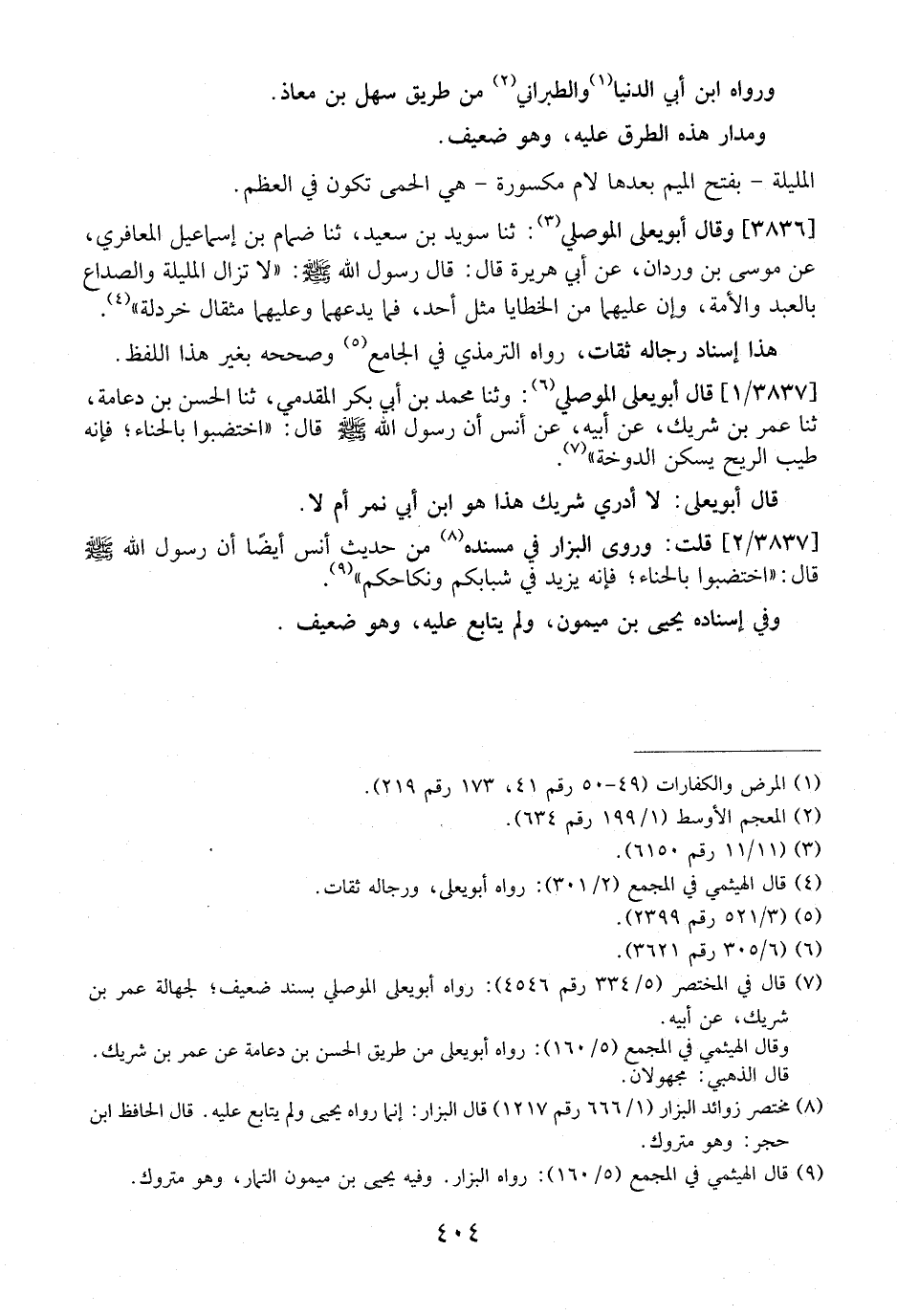 3837 / 1 - قَالَ أَبُو يَعْلَى الْمَوْصِلِيُّ: وثنا مُحَمَّدُ بْنُ أَبِي بَكْرٍ المقدمي، ثنا الحسن بن دعامة، ثنا عمر بْنُ شَرِيكٍ، عَنْ أَبِيهِ، عَنْ أَنَسٍ أَنّ رَسُولَ اللَّهِ - صَلَّى اللَّهُ عَلَيْهِ وَسَلَّمَ - قال: "اخْتَضِبُوا بِالْحِنَّاءِ؛ فَإِنَّهُ طَيِّبُ الرِّيحِ يُسَكِّنُ الدَّوْخَةَ".