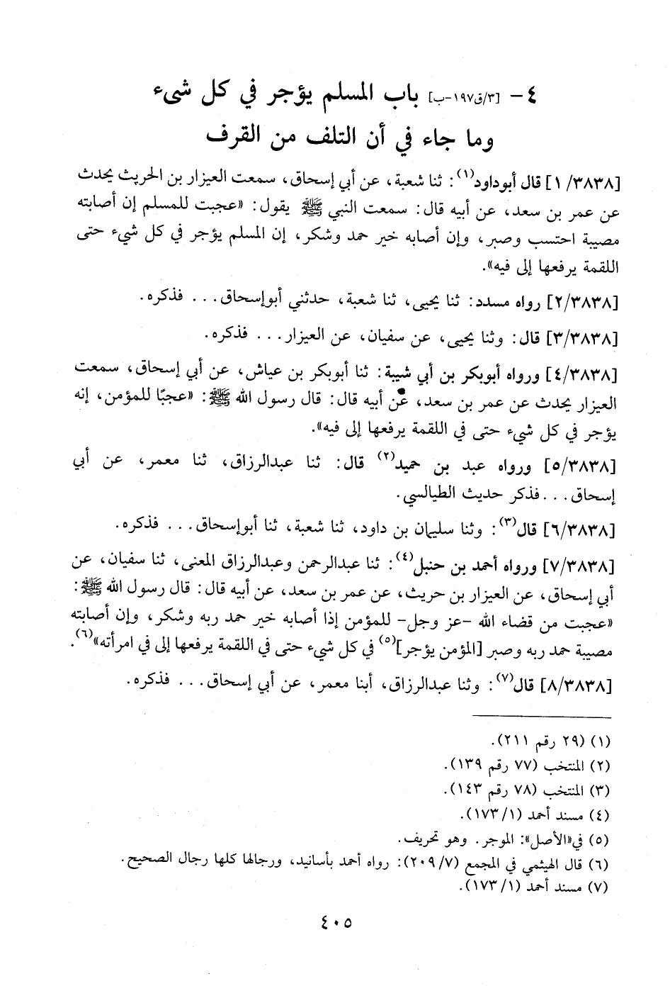 3838 / 7 - وَرَوَاهُ أَحْمَدُ بْنُ حَنْبَلٍ: ثَنَا عَبْدُ الرَّحْمَنِ وَعَبْدُ الرَّزَّاقِ الْمَعْنَى، ثنا سُفْيَانُ، عَنْ أَبِي إِسْحَاقَ، عَنِ الْعَيْزَارِ بْنِ حُرَيْثٍ، عَنْ عُمَرَ بْنِ سَعْدٍ، عَنْ أَبِيهِ قَالَ: قَالَ رَسُولُ اللَّهِ - صَلَّى اللَّهُ عَلَيْهِ وَسَلَّمَ -: "عَجِبْتُ مِنْ قَضَاءِ اللَّهِ -عَزَّ وَجَلَّ- لِلْمُؤْمِنِ إذا أَصَابَهُ خَيْرٌ حَمِدَ رَبَّهُ وَشَكَرَ، وَإِنْ أَصَابَتْهُ مُصِيبَةٌ حَمِدَ رَبَّهُ وَصَبَرَ [الْمُؤْمِنُ يُؤْجَرُ] فِي كُلِّ شَيْءٍ حَتَّى فِي اللُّقْمَةِ يَرْفَعُهَا إِلَى في امرأته".
