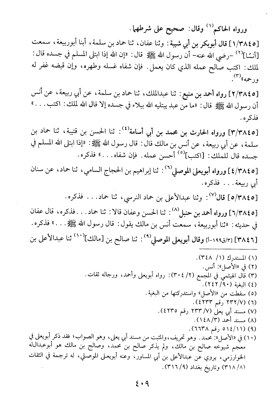 3845 / 2 - رَوَاهُ أَحْمَدُ بْنُ مَنِيعٍ: ثَنَا عَبْدُ الْمَلِكِ، ثنا حَمَّادُ بْنُ سَلَمَةَ، عَنْ أَبِي رَبِيعَةَ، عن أنس أن رسول - صَلَّى اللَّهُ عَلَيْهِ وَسَلَّمَ - قَالَ: "مَا مِنْ عَبْدٍ يَبْتَلِيهِ اللَّهُ بِبَلَاءٍ فِي جَسَدِهِ إِلَّا قال الله لملك: اكتب ... " فَذَكَرَهُ.