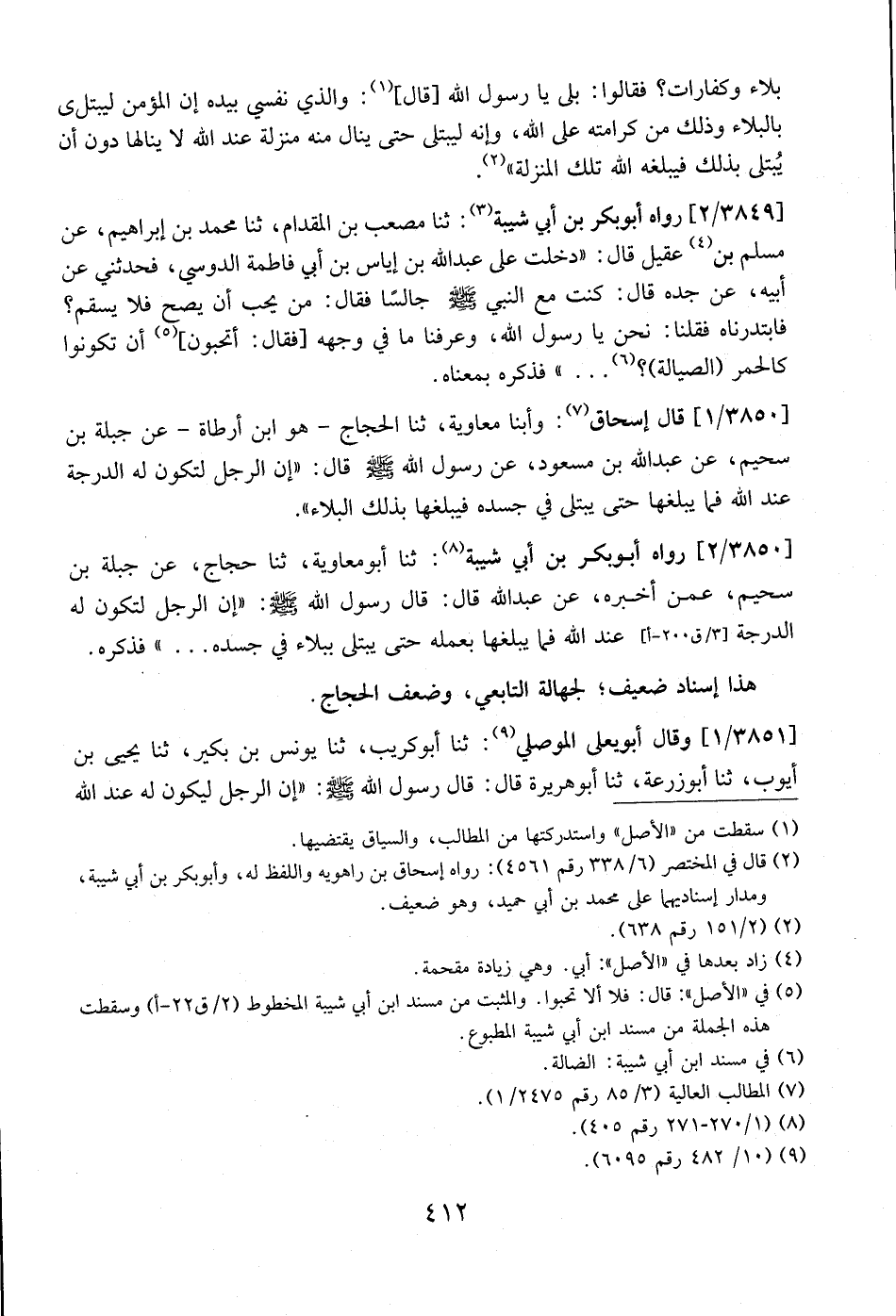 3850 / 1 - قَالَ إسحاق: وأبنا مُعَاوِيَةَ، ثنا الْحَجَّاجُ -هُوَ ابْنُ أَرْطَأَةَ- عَنْ جَبَلَةَ بْنِ سُحَيْمٍ، عْنَ عَبْدِ اللَّهِ بْنِ مَسْعُودٍ، عَنْ رَسُولِ اللَّهِ - صَلَّى اللَّهُ عَلَيْهِ وَسَلَّمَ - قَالَ: "إِنَّ الرَّجُلَ لَتَكُونُ لَهُ الدَّرَجَةُ عِنْدَ اللَّهِ فَمَا يَبْلُغُهَا حَتَّى يُبْتَلَى فِي جَسَدِهِ فَيَبْلُغُهَا بِذَلِكَ الْبَلَاءِ".