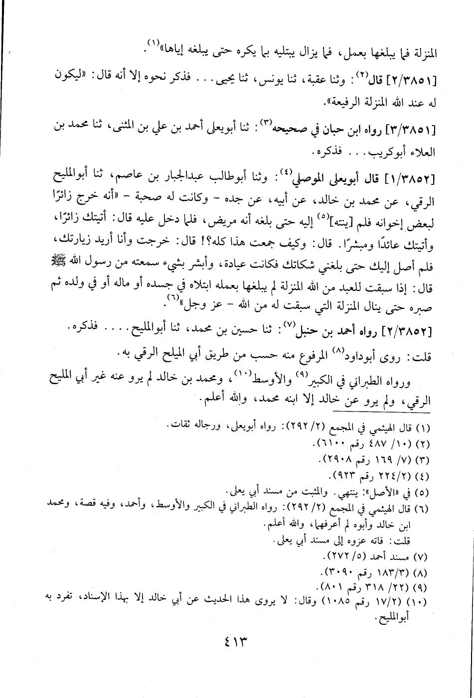 3852 / 1 - قَالَ أَبُو يَعْلَى الْمَوْصِلِيُّ: وَثَنَا أَبُو طَالِبٍ عَبْدُ الْجَبَّارِ بْنُ عَاصِمٍ، ثَنَا أَبُو الْمَلِيحِ الرَّقِّيُّ، عَنْ مُحَمَّدِ بْنِ خَالِدٍ، عَنْ أَبِيهِ، عَنْ جَدِّهِ -وَكَانَتْ لَهُ صُحْبَةٌ- "أَنَّهُ خَرَجَ زَائِرًا لِبَعْضِ إِخْوَانِهِ فَلَمْ [يَنْتَهِ] إِلَيْهِ حَتَّى بَلَغَهُ أَنَّهُ مَرِيضٌ، فَلَمَّا دَخَلَ عَلَيْهِ قَالَ: أَتَيْتُكَ زَائِرًا، وَأَتَيْتُكَ عَائِدًا وَمُبَشِّرًا. قَالَ: وَكَيْفَ جَمَعْتَ هَذَا كُلَّهُ؟! قَالَ: خَرَجْتُ وَأَنَا أُرِيدُ زِيَارَتَكَ، فلم أصل إليك حتى بلغني شكاتك فَكَانَتْ عِيَادَةً، وَأَبْشِرْ بِشَيْءٍ سَمِعْتُهُ مِنْ رَسُولِ اللَّهِ - صَلَّى اللَّهُ عَلَيْهِ وَسَلَّمَ - قَالَ: إِذَا سَبَقَتْ لِلْعَبْدِ مِنَ اللَّهِ الْمَنْزِلَةُ لَمْ يَبْلُغْهَا بعمله ابْتَلَاهُ فِي جَسَدِهِ أَوْ مَالِهِ أَوْ فِي وَلَدِهِ ثُمَّ صَبَّرَهُ حَتَّى يَنَالَ الْمَنْزِلَةَ الَّتِي سَبَقَتْ لَهُ مِنَ اللَّهِ -عَزَّ وَجَلَّ-".