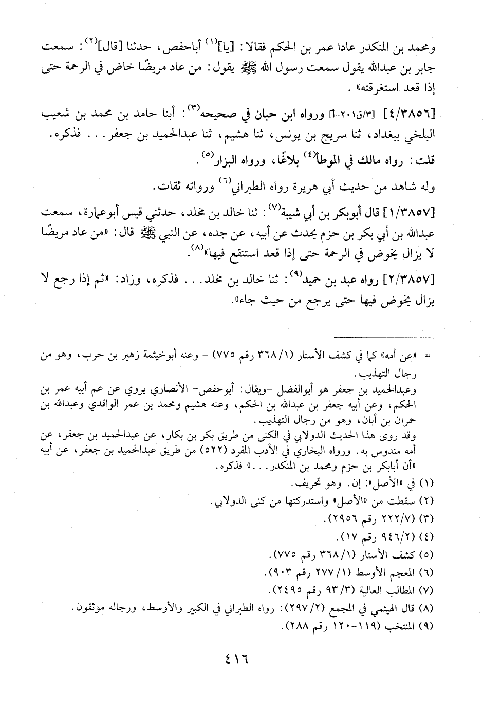 3857 / 1 - قَالَ أَبُو بَكْرِ بْنُ أَبِي شَيْبَةَ: ثنا خَالِدُ بْنُ مَخْلَدٍ، حَدَّثَنِي قَيْسٌ أَبُو عُمَارَةَ، سَمِعْتُ عَبْدَ اللَّهِ بْنَ أَبِي بَكْرِ بْنِ حَزْمٍ يُحَدِّثُ عَنْ أَبِيهِ، عَنْ جَدِّهِ، عَنِ النَّبِيِّ - صَلَّى اللَّهُ عَلَيْهِ وَسَلَّمَ - قَالَ: "مَنْ عَادَ مَرِيضًا لَا يَزَالُ يَخُوضُ فِي الرَّحْمَةِ حَتَّى إِذَا قَعَدَ اسْتَنْقَعَ فِيهَا".