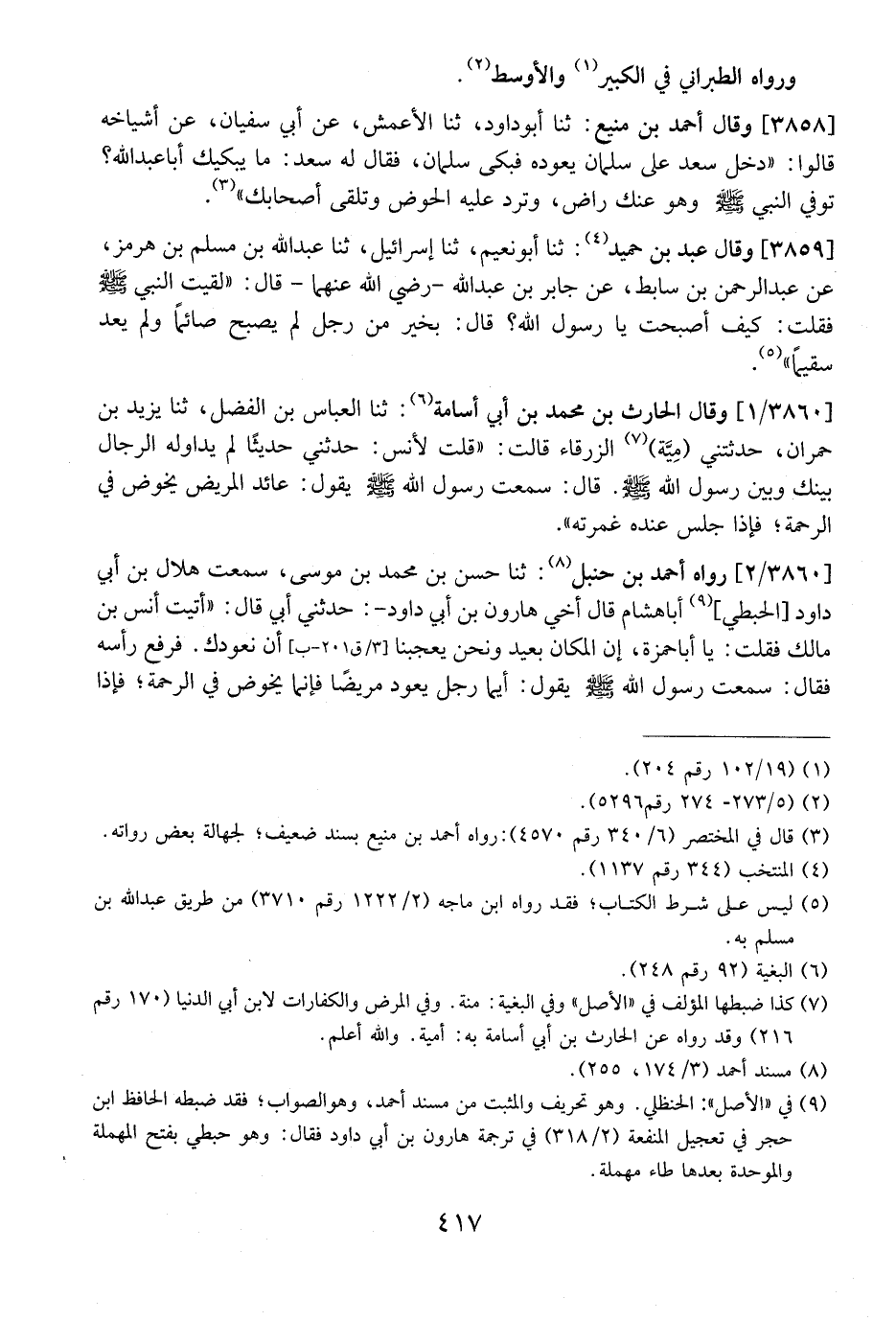 3860 / 2 - رَوَاهُ أَحْمَدُ بْنُ حَنْبَلٍ: ثَنَا حَسَنُ بْنُ مُحَمَّدِ بْنِ مُوسَى، سَمِعْتُ هِلَالَ بْنَ أَبِي داود [الحبطي] أبا هِشَامٌ قَالَ أَخِي هَارُونُ بْنُ أَبِي دَاوُدَ-: حَدَّثَنِي أَبِي قَالَ: "أَتَيْتُ أَنَسَ بْنَ مَالِكٍ فَقُلْتُ: يَا أَبَا حَمْزَةَ، إِنَّ الْمَكَانَ بَعِيدٌ ونحن يعجبنا [3/ ق 201-ب] أَنْ نَعُودَكَ. فَرَفَعَ رَأْسَهُ فَقَالَ: سَمِعْتُ رَسُولَ اللَّهِ - صَلَّى اللَّهُ عَلَيْهِ وَسَلَّمَ - يَقُولُ: أَيُّمَا رَجُلٍ يَعُودُ مَرِيضًا فَإِنَّمَا يَخُوضُ فِي الرَّحْمَةِ؛ فإذا
