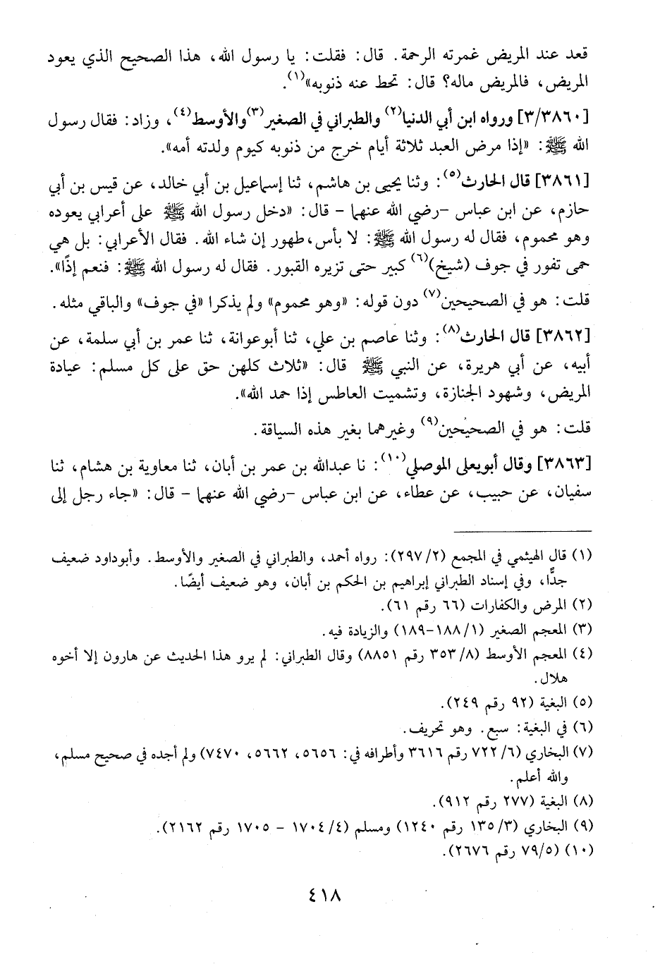 3861 - قَالَ الْحَارِثُ: وَثَنَا يَحْيَى بْنُ هَاشِمٍ، ثَنَا إِسْمَاعِيلُ بْنُ أَبِي خَالِدٍ، عَنْ قَيْسِ بْنِ أَبِي حَازِمٍ، عَنِ ابْنِ عَبَّاسٍ - رَضِيَ اللَّهُ عَنْهُمَا - قَالَ: "دَخَلَ رَسُولُ اللَّهِ - صَلَّى اللَّهُ عَلَيْهِ وَسَلَّمَ - عَلَى أَعْرَابِيٍّ يَعُودُهُ وَهُوَ مَحْمُومٌ، فَقَالَ لَهُ رَسُولُ اللَّهِ - صَلَّى اللَّهُ عَلَيْهِ وَسَلَّمَ -: لَا بَأْسَ، طَهُورٌ إِنْ شَاءَ اللَّهُ. فَقَالَ الْأَعْرَابِيُّ: بَلْ هِيَ حُمًّى تَفُورُ فِي جَوْفِ (شَيْخٍ) كَبِيرٍ حَتَّى تزيره القبور. فَقَالَ لَهُ رَسُولُ اللَّهِ - صَلَّى اللَّهُ عَلَيْهِ وَسَلَّمَ -: فنعم إذا".