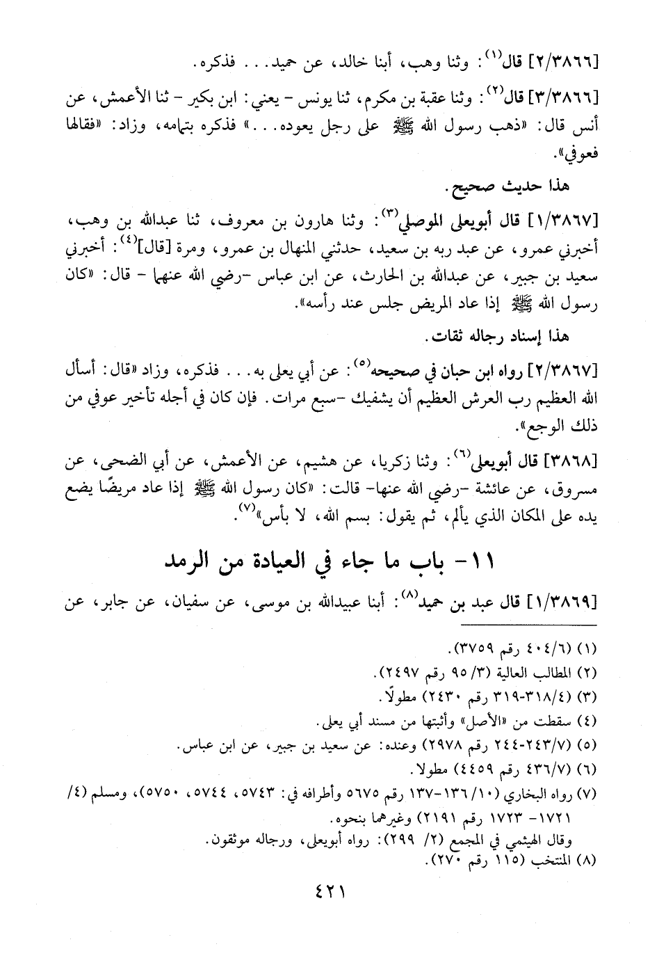 3867 / 1 - قَالَ أَبُو يَعْلَى الْمَوْصِلِيُّ: وثنا هَارُونُ بْنُ مَعْرُوفِ، ثَنَا عَبْدُ اللَّهِ بْنُ وَهْبٍ، أَخْبَرَنِي عَمْرٌو، عَنْ عَبْدِ رَبِّهِ بْنِ سعيد، حدثني المنهال بن عمرو، ومرة [قال] : أَخْبَرَنِي سَعِيدُ بْنُ جُبَيْرٍ، عَنْ عَبْدِ اللَّهِ بْنِ الْحَارِثُ، عَنِ ابْنِ عَبَّاسٍ - رَضِيَ اللَّهُ عَنْهُمَا - قَالَ: "كَانَ رَسُولُ اللَّهِ - صَلَّى اللَّهُ عَلَيْهِ وَسَلَّمَ - إِذَا عَادَ الْمَرِيضَ جَلَسَ عِنْدَ رأسه".