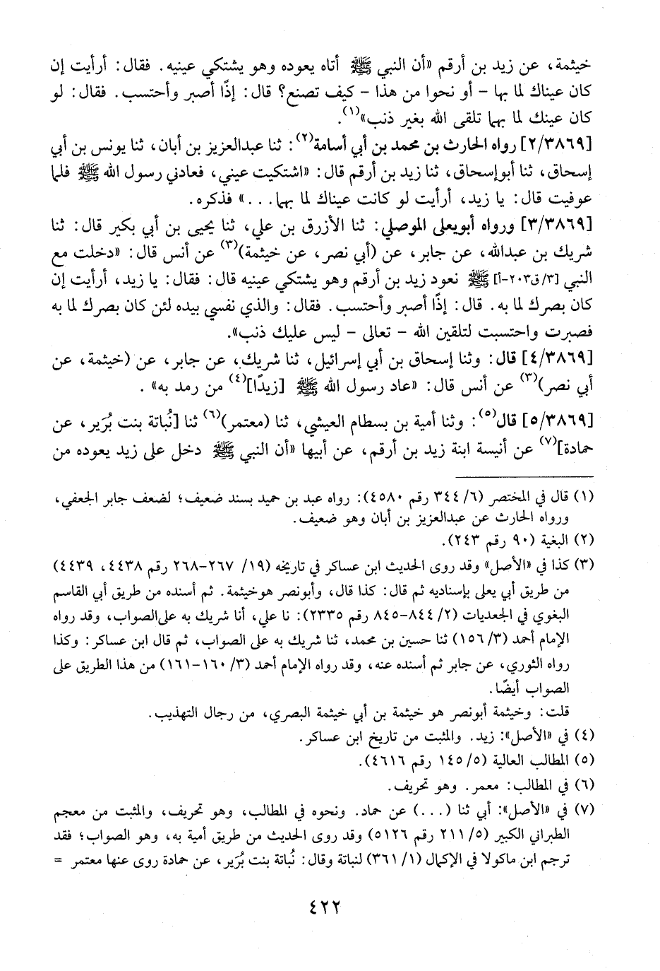 3869 / 2 - رَوَاهُ الْحَارِثُ بْنُ مُحَمَّدِ بْنِ أَبِي أُسَامَةَ: ثنا عَبْدُ الْعَزِيزِ بْنُ أَبَانٍ، ثنا يُونُسُ بْنُ أَبِي إِسْحَاقَ، ثنا أَبُو إِسْحَاقَ، ثنا زَيْدُ بْنُ أَرْقَمَ قَالَ: "اشْتَكَيْتُ عَيْنِي، فَعَادَنِي رَسُولُ اللَّهِ - صَلَّى اللَّهُ عَلَيْهِ وَسَلَّمَ - فَلَمَّا عُوفِيتُ قال: يا زيد، أرأيت لو كانت عيناك لما بهما ... " فذكره.