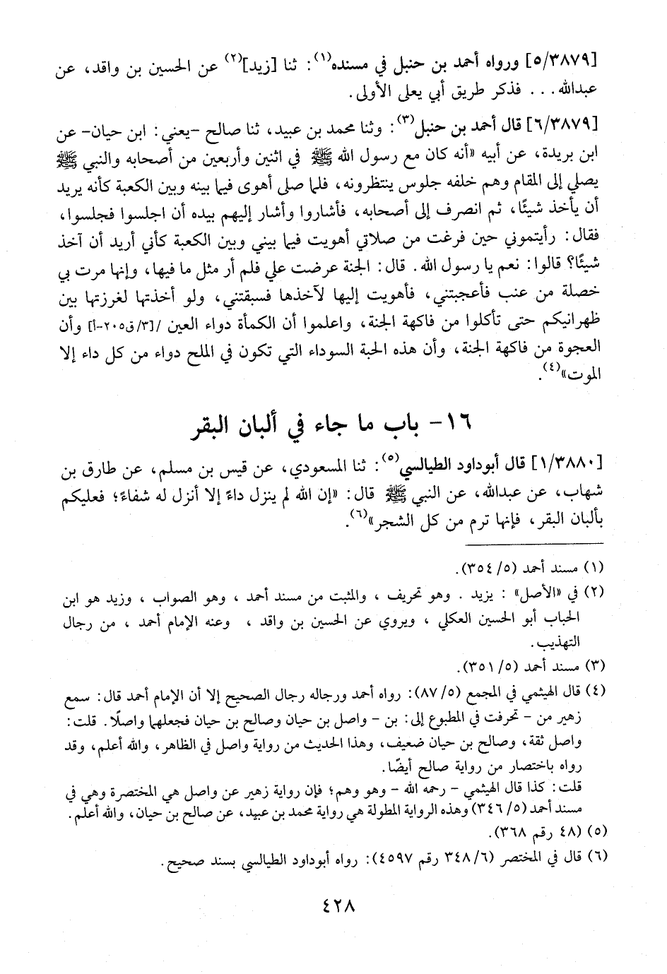 3879 / 6 - قَالَ أَحْمَدُ بْنُ حَنْبَلٍ: وثنا مُحَمَّدُ بْنُ عُبَيْدٍ، ثنا صالح -يعني: ابن حيان- عَنِ ابْنِ بُرَيْدَةَ، عَنْ أَبِيهِ "أَنَّهُ كَانَ مَعَ رَسُولِ اللَّهِ - صَلَّى اللَّهُ عَلَيْهِ وَسَلَّمَ - فِي اثْنَيْنِ وَأَرْبَعِينَ مِنْ أَصْحَابِهِ وَالنَّبِيُّ - صَلَّى اللَّهُ عَلَيْهِ وَسَلَّمَ - يُصَلِّي إِلَى الْمَقَامِ وَهُمْ خلفه جلوس ينتظرونه، فَلَمَّا صَلَّى أَهْوَى فِيمَا بَيْنَهُ وَبَيْنَ الْكَعْبَةِ كَأَنَّهُ يُرِيدُ أَنْ يَأْخُذَ شَيْئًا، ثُمَّ انْصَرَف َإِلَى أَصْحَابِهِ، فَأَشَارُوا وَأَشَارَ إِلَيْهِمْ بِيَدِهِ أَنِ اجْلِسُوا فَجَلَسُوا، فَقَالَ: رَأَيْتُمُونِي حِينَ فَرَغْتُ مِنْ صَلَاتِي أَهْوَيْتُ فِيمَا بَيْنِي وَبَيْنِ الْكَعْبَةِ كَأَنِّي أُرِيدُ أَنْ آخُذَ شَيْئًا؟ قَالُوا: نَعَمْ يَا رَسُولَ اللَّهِ. قَالَ: الْجَنَّةُ عُرِضَتْ عَلَيَّ فَلَمْ أر مثل ما فيها، وإنها مَرَّتْ بِي خُصْلَةٌ مِنْ عِنَبٍ فَأَعْجَبَتْنِي، فَأَهْوَيْتُ إِلَيْهَا لِآخُذَهَا فَسَبَقَتْنِي، وَلَوْ أَخَذْتُهَا لَغَرَزْتُهَا بَيْنَ ظَهَرَانَيْكُمْ حَتَّى تَأْكُلُوا مِنْ فَاكِهَةِ الْجَنَّةِ، وَاعْلَمُوا أن الكمأة دواء العين / [3/ ق 205-أ] وَأَنَّ الْعَجْوَةَ مِنْ فَاكِهَةِ الْجَنَّةِ، وَأَنَّ هَذِهِ الْحَبَّةَ السَّوْدَاءَ الَّتِي تَكُونُ فِي الْمِلْحِ دَوَاءٌ مِنْ كُلِّ دَاءٍ إِلَّا الْمَوْتَ".
