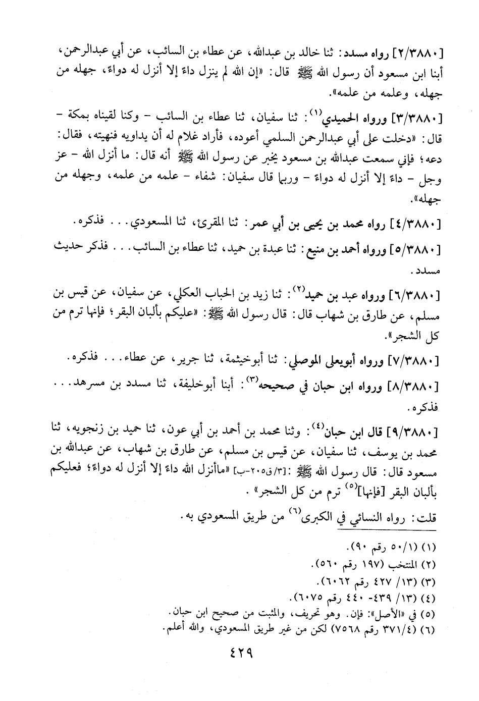 3880 / 9 - قَالَ ابْنُ حِبَّانَ: وثنا مُحَّمَدُ بْنُ أَحْمَدَ بْنِ أَبِي عَوْنٍ، ثنا حُمَيْدُ بْنُ زَنْجَوَيْهِ، ثنا مُحَمَّدُ بْنُ يُوسُفَ، ثَنَا سُفْيَانُ، عَنْ قَيْسِ بْنِ مُسْلِمٍ، عَنْ طَارِقِ بْنِ شهاب، عَنْ عَبْدِ اللَّهِ بْنِ مَسْعُودٍ قَالَ: قَالَ رَسُولُ اللَّهِ - صَلَّى اللَّهُ عَلَيْهِ وَسَلَّمَ -: [3/ ق 205-ب] "مَا أَنْزَلَ اللَّهُ دَاءً إِلَّا أَنْزَلَ لَهُ دَوَاءً؛ فَعَلَيْكُمْ بِأَلْبَانِ الْبَقَرِ [فَإِنِّهَا] تُرَمُّ مِنْ كُلِّ الشَّجَرِ".