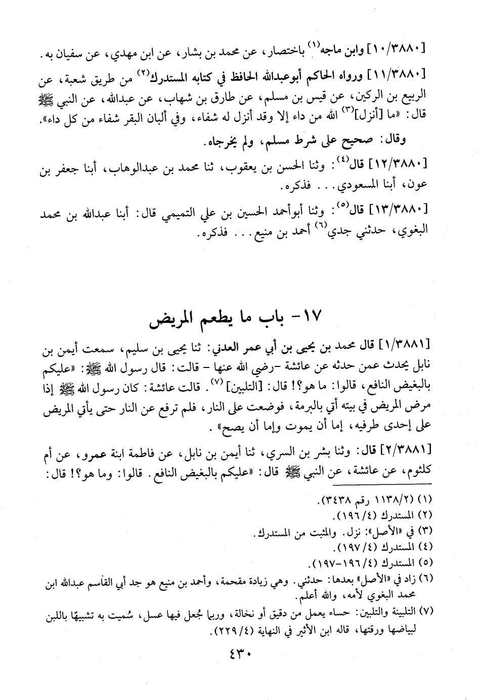 3881 / 1 - قَالَ مُحَمَّدُ بْنُ يَحْيَى بْنِ أَبِي عُمَرَ الْعَدَنِيّ: ثنا يَحْيَى بْنُ سُلَيْمٍ، سَمِعْتُ أيمن بن نابل يحدث عَمَّنْ حَدَّثَهُ عَنْ عَائِشَةَ - رَضِيَ اللَّهُ عَنْهَا - قَالَتْ: قَالَ رَسُولُ اللَّهِ - صَلَّى اللَّهُ عَلَيْهِ وَسَلَّمَ -: "عَلَيْكُمْ بالبغيض النافع، قالوا: ما هُوَ؟! قَالَ: [التَّلْبِينُ] . قَالَتْ عَائِشَةُ: كَانَ رَسُولُ اللَّهِ - صَلَّى اللَّهُ عَلَيْهِ وَسَلَّمَ - إِذَا مَرِضَ الْمَرِيضُ فِي بَيْتِهِ أَتَى بِالْبَرَمَةِ، فَوُضِعَتْ عَلَى النَّارِ، فَلَمْ تُرْفَعْ عَنِ النَّارِ حَتَّى يَأْتِي الْمَرِيضَ عَلَى إِحْدَى طَرَفَيْهِ، إِمَّا أَنْ يَمُوتَ وَإِمَّا أَنْ يَصِحَّ".