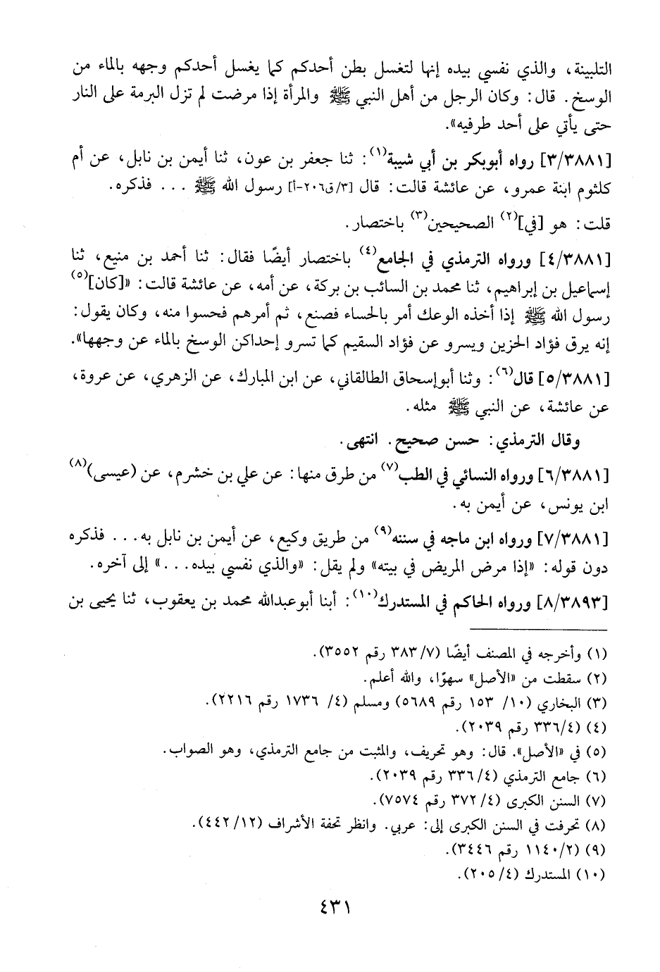 3881 / 4 - وَرَوَاهُ التِّرْمِذِيُّ فِي الْجَامِعِ بِاخْتِصَارٍ أَيْضًا فَقَالَ: ثَنَا أَحْمَدُ بْنُ مَنِيعٍ، ثَنَا إِسْمَاعِيلُ بْنُ إِبْرَاهِيمَ، ثنا مُحَمَّدِ بْنِ السَّائِبِ بْنِ بَرَكَةَ، عَنْ أُمِّهِ، عَنْ عَائِشَةَ قَالَتْ: " [كَانَ] رَسُولُ اللَّهِ - صَلَّى اللَّهُ عَلَيْهِ وَسَلَّمَ - إِذَا أَخَذَهُ الْوَعْكُ أَمَرَ بِالْحِسَاءِ فَصُنِعَ، ثُمَّ أَمَرَهُمْ فَحَسَوْا مِنْهُ، وَكَانَ يَقُولُ: أَنَّهُ يُرِقُّ فُؤَادَ الْحَزِينِ وَيَسْرُو عَنْ فُؤَادِ السَّقِيمِ كَمَا تسرو إِحْدَاكُنَّ الْوَسَخَ بِالْمَاءِ عَنْ وَجْهِهَا".