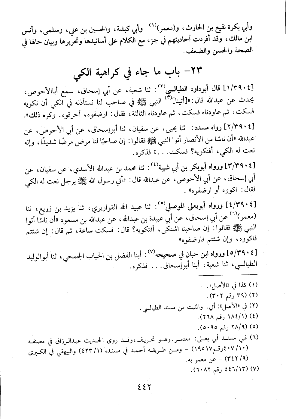 3904 / 1 - قَالَ أَبُو دَاوُدَ الطَّيَالِسِيُّ: ثَنَا شُعْبَةُ، عَنْ أَبِي إِسْحَاقَ، سَمِعَ أَبَا الْأَحْوَصِ، يُحَدِّثُ عَنْ عبد الله قال: " [أتينا] النَّبِيَّ - صَلَّى اللَّهُ عَلَيْهِ وَسَلَّمَ - فِي صَاحِبٍ لَنَا نَسْتَأْذِنْهُ فِي الْكَيِّ أَنْ نَكْوِيَهُ فَسَكَتَ، ثم عاودناه فسكت، ثم عاودناه الثَّالِثَةَ، فَقَالَ: ارْضِفُوهُ، أَحْرِقُوهُ. وَكَرِهَ ذَلِكَ".
