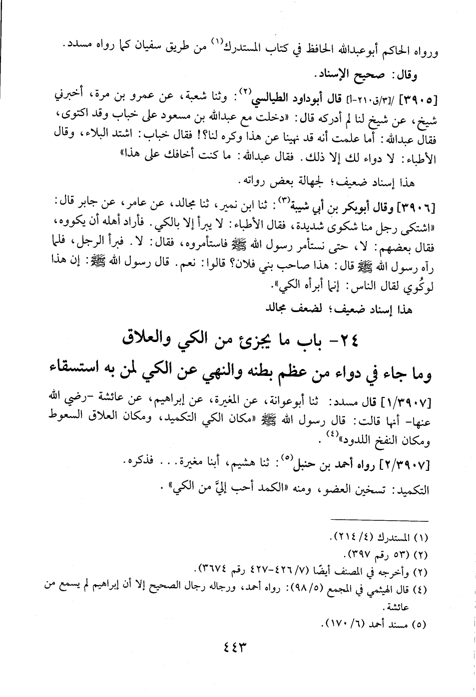 3907 / 1 - قَالَ مُسَدَّد: ثَنَا أَبُو عَوَانَةَ، عَنِ الْمُغِيرَةِ، عَنْ إِبْرَاهِيمَ، عَنْ عَائِشَةَ - رَضِيَ اللَّهُ عَنْهَا - أَنَّهَا قَالَتْ: قَالَ رَسُولُ اللَّهِ - صَلَّى اللَّهُ عَلَيْهِ وَسَلَّمَ - "مَكَانُ الْكَيِّ التَّكْمِيدُ، وَمَكَانُ الْعِلَاقِ السُّعُوطُ وَمَكَانُ النَّفْخِ اللَّدُودُ".