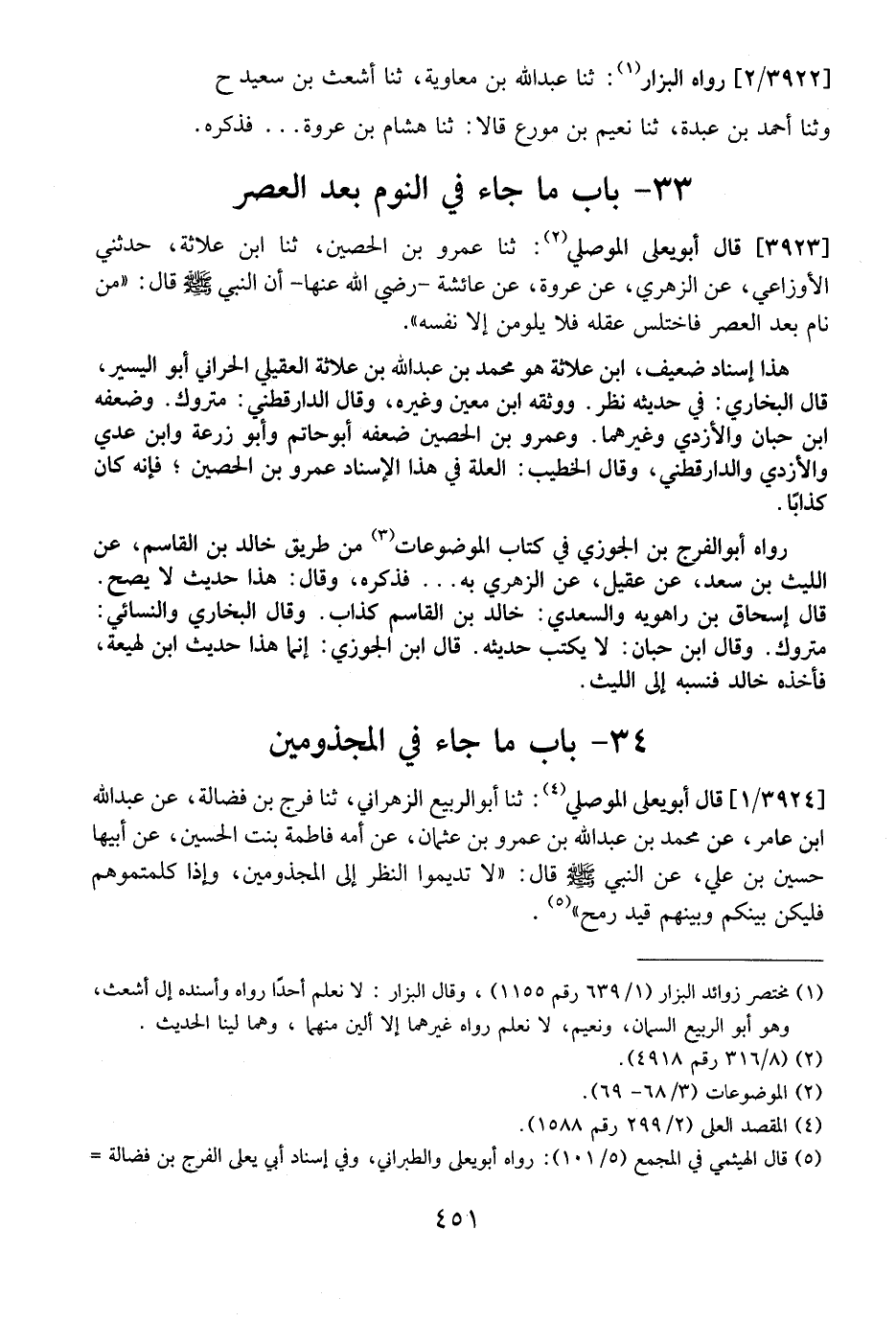3923 - قَالَ أَبُو يَعْلَى الْمَوْصِلِيُّ: ثَنَا عَمْرُو بْنُ الحصين، ثَنَا ابْنُ عُلَاثَةَ، حَدَّثَنِي الْأَوْزَاعِيُّ، عَنِ الزُّهْرِيِّ، عَنْ عُرْوَةَ، عَنْ عَائِشَةَ - رَضِيَ اللَّهُ عَنْهَا - أَنّ النَّبِيَّ - صَلَّى اللَّهُ عَلَيْهِ وَسَلَّمَ -: "مَنْ نَامَ بَعْدَ الْعَصْرِ فَاخْتَلَسَ عَقْلُهُ فَلَا يَلُومَنَّ إِلَّا نَفْسَهُ".