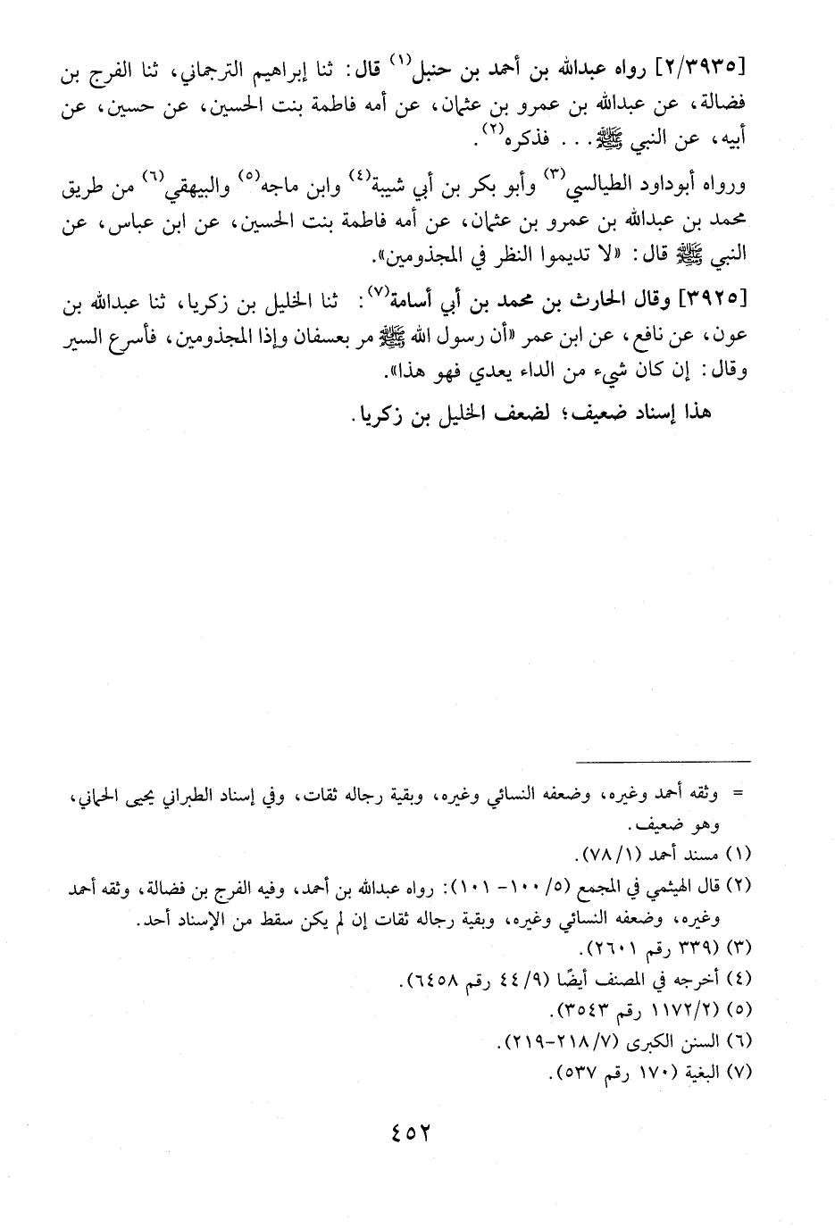 3935 / 2 - رَوَاهُ عَبْدُ اللَّهِ بْنُ أَحْمَدَ بْنِ حَنْبَلٍ قال: ثنا إِبْرَاهِيمَ التُّرْجُمَانِيُّ، ثنا الْفَرَجُ بْنُ فَضَالَةَ، عَنْ عَبْدِ اللَّهِ بْنِ عَمْرِو بْنِ عُثْمَانَ، عَنْ أُمِّهِ فَاطِمَةَ بِنْتِ الْحُسَيْنِ، عَنْ حُسَيْنٍ، عَنْ أَبِيهِ، عَنِ النَّبِيِّ - صَلَّى اللَّهُ عَلَيْهِ وَسَلَّمَ - ... فَذَكَرَهُ.