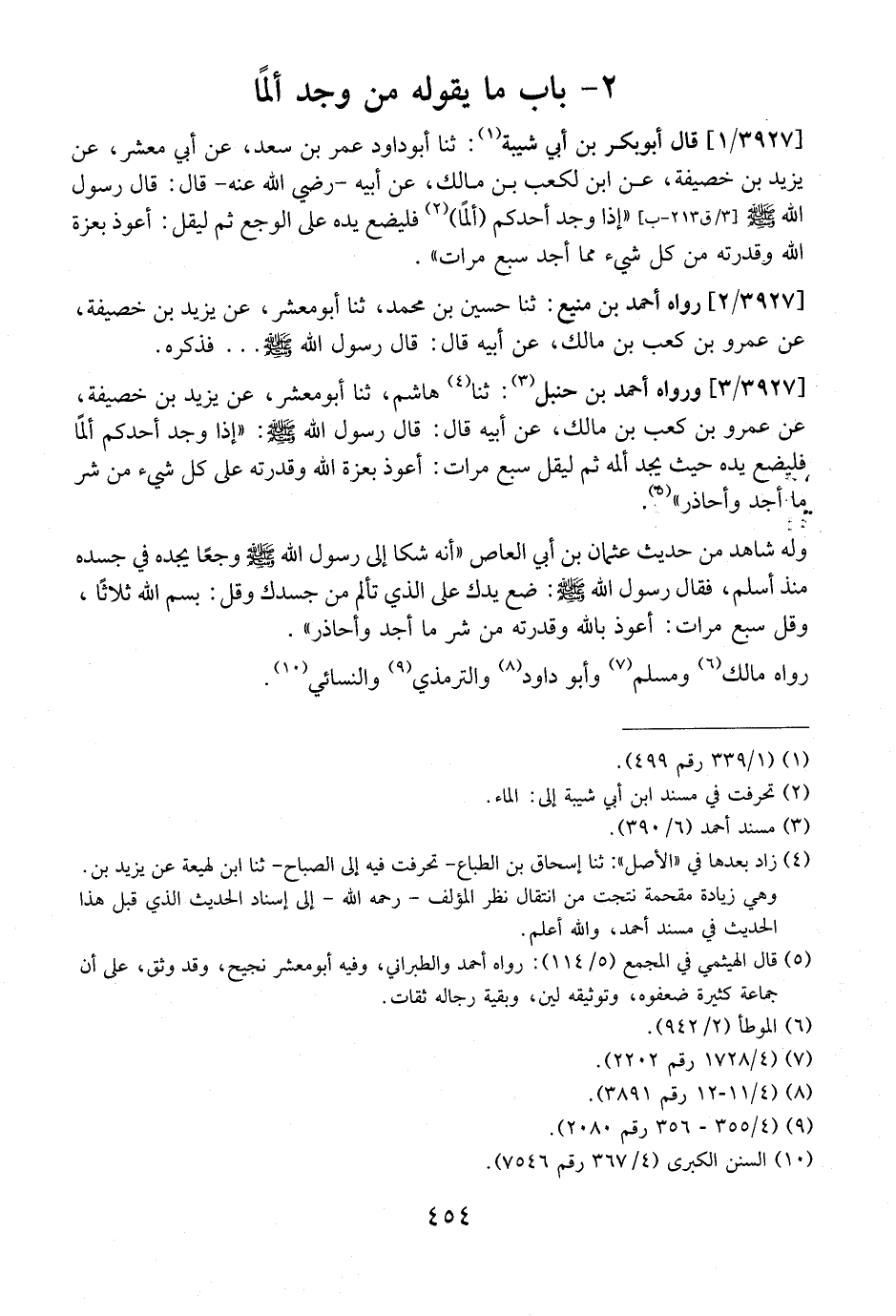 3927 / 3 - وَرَوَاهُ أَحْمَدُ بْنُ حَنْبَلٍ: ثنا هَاشِمٌ، ثنا أَبُو مَعْشَرٍ، عَنْ يَزِيدَ بْنِ خَصِيفَةَ، عَنْ عَمْرِو بْنِ كَعْبِ بْنِ مَالِكٍ، عَنْ أَبِيهِ قَالَ: قَالَ رَسُولُ اللَّهِ - صَلَّى اللَّهُ عَلَيْهِ وَسَلَّمَ -: "إِذَا وَجَدَ أَحَدُكُمْ أَلَمًا فَلْيَضَعْ يَدَهُ حَيْثُ يَجِدُ أَلَمَهُ ثُمَّ لْيَقُلْ سَبْعَ مَرَّاتٍ: أَعُوذُ بِعِزَّةِ اللَّهِ وَقُدْرَتِهِ عَلَى كُلِّ شَيْءٍ مِنْ شَرِّ مَا أَجِدُ وَأحَاذِرُ".