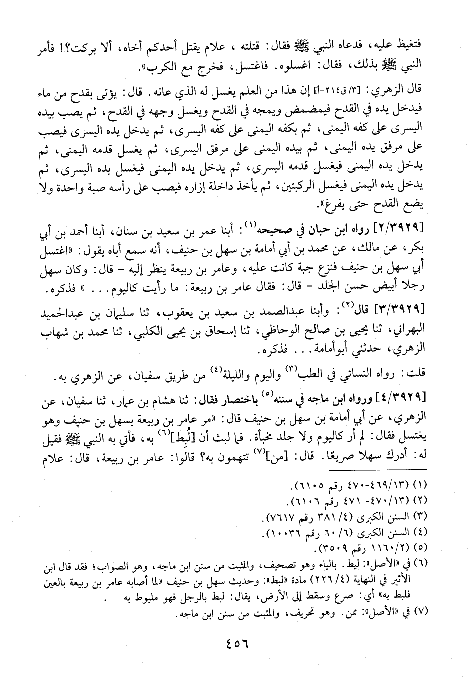 3929 / 4 - وَرَوَاهُ ابْنُ مَاجَهْ فِي سُنَنِهِ بِاخْتِصَارٍ فَقَالَ: ثنا هِشَامُ بْنُ عَمَّارٍ، ثنا سُفْيَانُ، عَنِ الزَّهْرِيِّ، عَنْ أَبِي أُمَامَةَ بْنِ سَهْلِ بْنِ حُنَيْفٍ قَالَ: "مَرَّ عَامِرُ بْنُ رَبِيعَةَ بِسَهْلِ بْنِ حُنَيْفٍ وَهُوَ يَغْتَسِلُ فَقَالَ: لَمْ أَرَ كَالْيَوْمِ وَلَا جِلْدَ مُخَبَّأَةً. فَمَا لَبِثَ أَنْ [لُبط] بِهِ، فَأَتَى بِهِ النَّبِيُّ - صَلَّى اللَّهُ عَلَيْهِ وَسَلَّمَ - فَقِيلَ لَهُ: أدرك سهلا صريعًا. قال: [من] تَتَّهِمُونَ بِهِ؟ قَالُوا: عَامِرَ بْنَ رَبِيعَةَ، قَالَ: علام