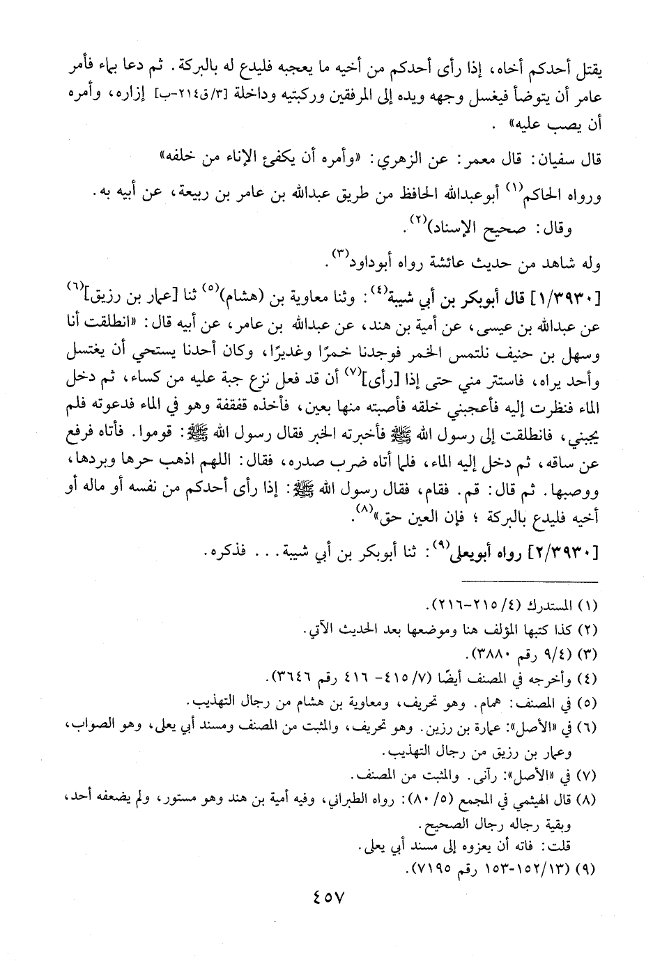 3930 / 1 - قَالَ أَبُو بَكْرِ بْنُ أَبِي شَيْبَةَ: وَثَنَا مُعَاوِيَةُ بْنُ (هِشَامٍ) ثنا [عمار بْنُ رُزَيْقٍ] عَنْ عَبْدِ اللَّهِ بْنِ عِيسَى، عَنْ أُمَيَّةَ بْنِ هِنْدَ، عَنْ عَبْدِ اللَّهِ بْنِ عَامِرٍ، عَنْ أَبِيهِ قَالَ: "انْطَلَقْتُ أَنَا وَسَهْلُ بْنُ حُنَيْفٍ نلتمس الخمر فوجدنا خمرا وغديرا، وكان أحدنا يستحي أَنْ يغتسل وَأَحَدٌ يَرَاهُ، فَاسْتَتَرَ مِنِّي حَتَّى إِذَا [رَأَى] أَنْ قَدْ فَعَلَ نَزَعَ جُبَّةً عَلَيْهِ مِنْ كِسَاءٍ، ثُمَّ دَخَلَ الْمَاءَ فَنَظَرَت إِلَيْهِ فَأَعْجَبَنِي خَلْقُهُ فَأَصَبْتُهُ مِنْهَا بِعَيْنٍ، فَأَخَذَهُ قَفْقَفُهُ وَهُوَ فِي الْمَاءِ فَدَعَوْتُهُ فَلَمْ يُجِبْنِي، فَانْطَلَقْتُ إِلَى رَسُولِ اللَّهِ - صَلَّى اللَّهُ عَلَيْهِ وَسَلَّمَ - فَأَخْبَرْتُهُ الْخَبَرَ فَقَالَ رَسُولُ اللَّهِ - صَلَّى اللَّهُ عَلَيْهِ وَسَلَّمَ -: قُومُوا. فَأَتَاهُ فَرَفَعَ عَنْ سَاقِهِ، ثُمَّ دَخَلَ إِلَيْهِ الْمَاءَ، فَلَمَّا أَتَاهُ ضَرَبَ صَدْرَهَ، فَقَالَ: اللَّهُمَّ أَذْهِبْ حَرَّهَا وَبَرْدَهَا، وَوَصَبَهَا. ثُمَّ قَالَ: قُمْ. فَقَامَ، فَقَالَ رَسُولُ اللَّهِ - صَلَّى اللَّهُ عَلَيْهِ وَسَلَّمَ -: إِذَا رَأَى أَحَدُكُمْ مِنْ نَفْسِهِ أَوْ مَالِهِ أَوْ أَخِيهِ فَلْيَدْعُ بِالْبَرَكَةِ؛ فَإِنَّ العين حق".