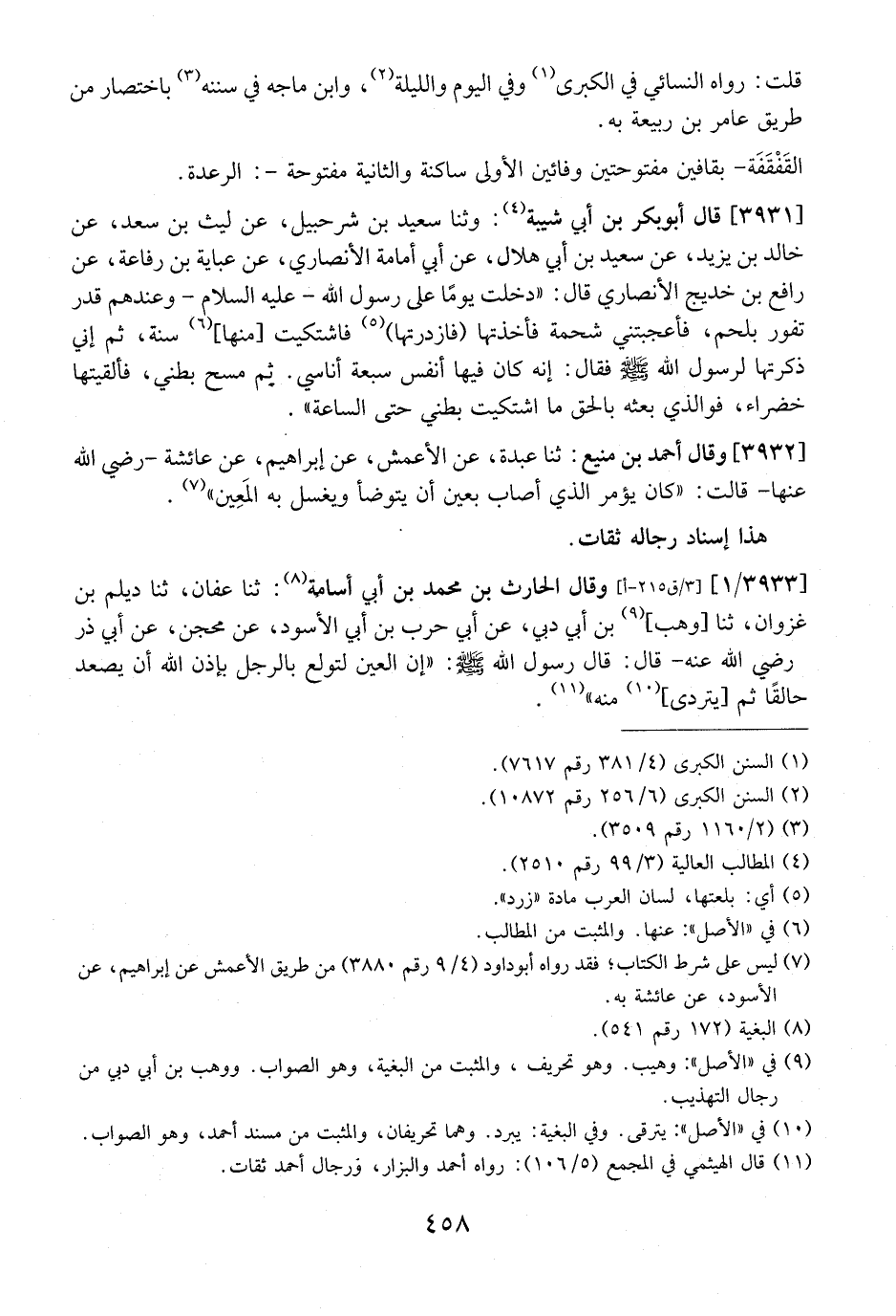 3931 - قَالَ أَبُو بَكْرِ بْنُ أَبِي شَيْبَةَ: وَثَنَا سعيد بْنُ شُرَحْبِيلَ، عَنْ لَيْثُ بْنُ سْعَدٍ، عَنْ خَالِدِ بْنِ يَزِيدَ، عَنْ سعيد بن أبي هِلَالٍ، عَنْ أَبِي أُمَامَةَ الْأَنْصَارِيِّ، عَنْ عَبَايَةَ بْنِ رِفَاعَةَ، عَنْ رَافِعِ بْنِ خُدَيْجٍ الْأَنْصَارِيِّ قال: "دخلت يومًا على رسول الله -عليه السلام- وعندهم قدر تفور بلحم، فأعجبتني شَحْمَةٌ فَأَخَذْتُهَا (فَازْدَرْتُهَا) فَاشْتَكَيْتُ [مِنْهَا] سَنَةً، ثُمُّ إِنِّي ذَكَرْتُهَا لِرَسُولِ اللَّهِ - صَلَّى اللَّهُ عَلَيْهِ وَسَلَّمَ - فَقَالَ: إِنَّهُ كَانَ فِيهَا أَنْفُسُ سَبْعَةِ أناسي. ثُمَّ مَسَحَ بَطْنِي، فَأَلْقَيْتُهَا خَضْرَاءَ، فَوَالَّذِي بَعْثَهُ بِالْحَقِّ مَا اشْتَكَيْتُ بَطْنِي حَتَّى السَّاعَةَ".