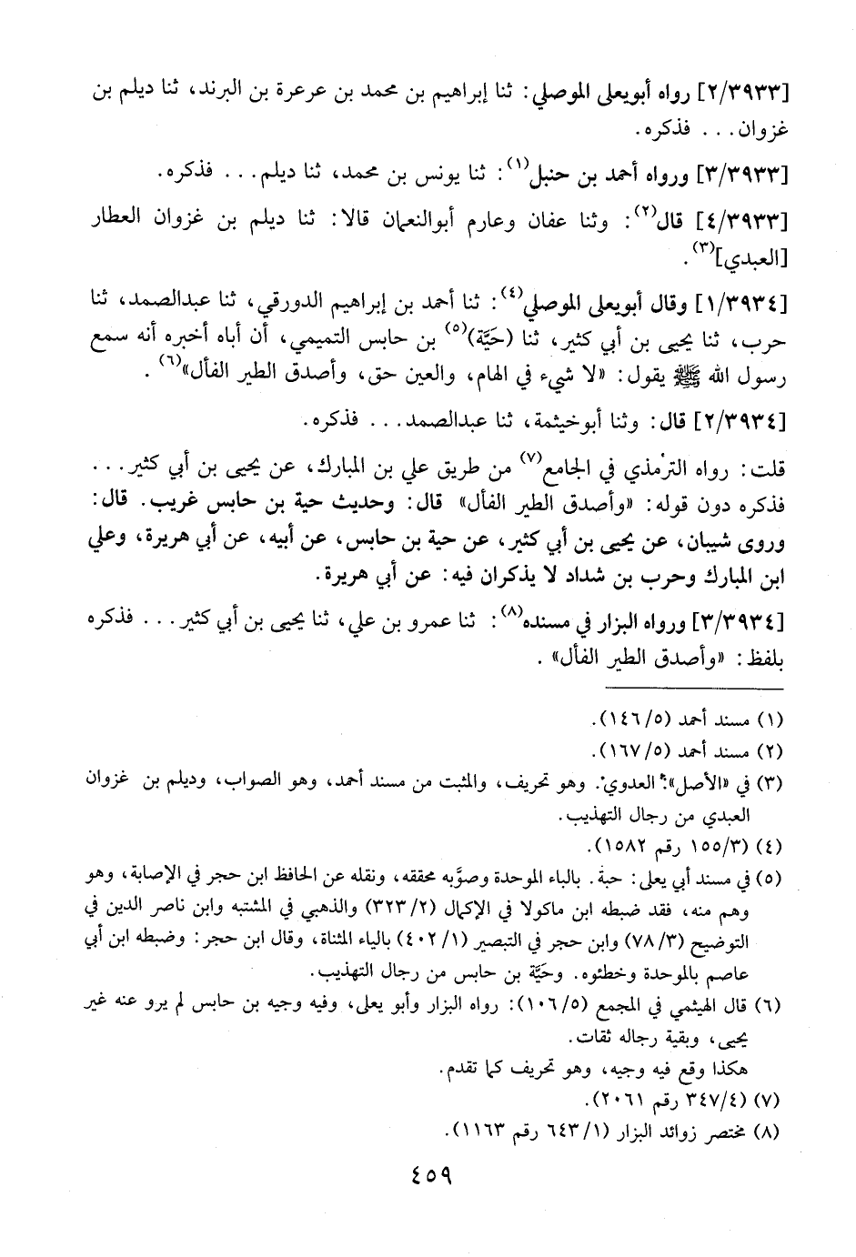 3934 / 1 - وَقَالَ أَبُو يَعْلَى الْمَوْصِلِيُّ: ثَنَا أَحْمَدُ بْنُ إِبْرَاهِيمَ الدَّوْرَقِيُّ، ثنا عَبْدُ الصَّمَدِ، ثنا حَرْبٌ، ثنا يَحْيَى بْنُ أَبِي كَثِيرٍ، ثنا (حَيَّة) بْنُ حَابِسٍ التَّمِيمِيُّ، أَنَّ أَبَاهُ أَخْبَرَهُ أَنَّهُ سَمِعَ رَسُولَ اللَّهِ - صَلَّى اللَّهُ عَلَيْهِ وَسَلَّمَ - يَقُولُ: "لَا شَيْءَ فِي الْهَامِّ، وَالْعَيْنِ حَقٌّ، وَأَصْدَقُ الطَّيْرِ الْفَأْلُ".