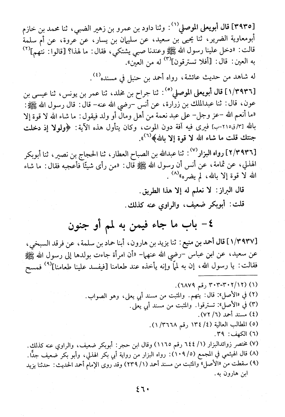 3936 / 1 - قَالَ أَبُو يَعْلَى الْمَوْصِلِيُّ: ثنا جَرَّاحُ بْنُ مَخْلَدٍ، ثنا عُمَرُ بْنُ يونس، ثنا عيسى بن عون، قال: ثنا عَبْدُ الْمَلِكِ بْنُ زُرَارَةَ، عَنْ أَنَسٍ - رَضِيَ اللَّهُ عَنْهُ - قَالَ: قَالَ رَسُولُ اللَّهِ - صَلَّى اللَّهُ عَلَيْهِ وَسَلَّمَ -: "مَا أَنْعَمَ اللَّهُ -عَزَّ وجل- على عبد نعمة من أهل ومال أَوْ وَلَدٍ فَيَقُولُ: مَا شَاءَ اللَّهُ لَا قوة إلا بالله [3/ ق 215-ب] فَيَرَى فِيهِ آفَةً دَونَ الْمَوْتِ، وَكَانَ يَتَأَوَّلُ هَذِهِ الْآيَةَ: (وَلَوْلا إِذْ دَخَلْتَ جَنَّتَكَ قُلْتَ ما شاء الله لا قوة إلا بالله) ".