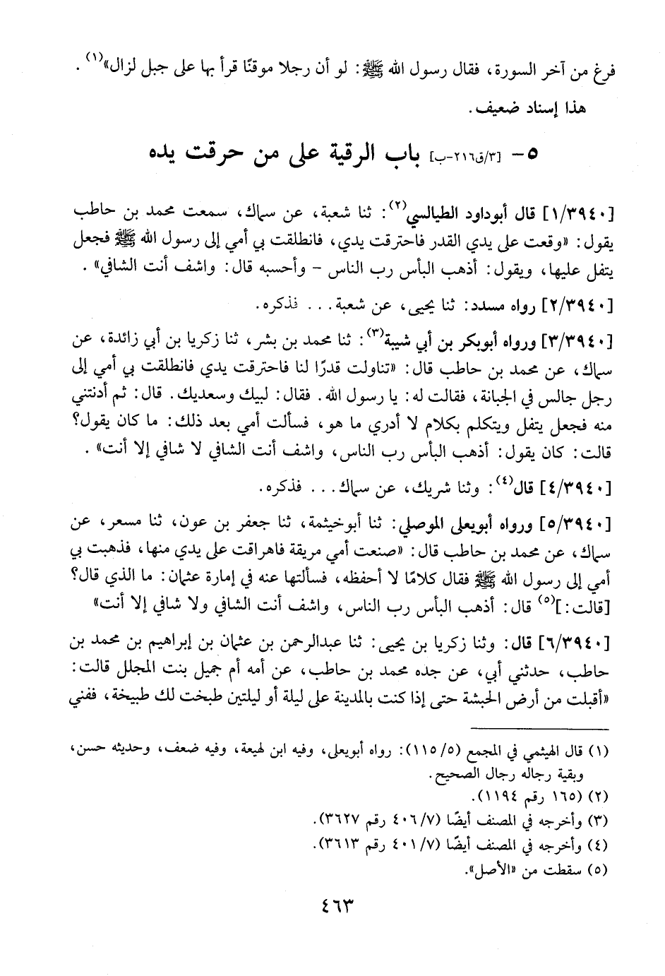 3940 / 5 - وَرَوَاهُ أَبُو يَعْلَى الْمَوْصِلِيُّ: ثَنَا أَبُو خَيْثَمَةَ، ثنا جَعْفَرُ بْنُ عَوْنٍ، ثنا مسعر، عَنْ سِمَاكٍ، عَنْ مُحَمَّدِ بْنِ حَاطِبٍ قَالَ: "صنعت أمي مريقة فَأَهْرَاقَتْ عَلَى يَدِي مِنْهَا، فَذَهَبَتْ بِي أُمِّي إِلَى رَسُولِ اللَّهِ - صَلَّى اللَّهُ عَلَيْهِ وَسَلَّمَ - فَقَالَ كَلَامًا لَا أَحْفَظُهُ، فَسَأَلْتُهَا عَنْهُ فِي إمارة عثمان: ما الذي قال؟ [قالت:] قَالَ: أَذْهِبِ الْبَأْسَ رَبَّ النَّاسِ، وَاشْفِ أَنْتَ الشَّافِي وَلَا شَافِيَ إِلَّا أَنْتَ"