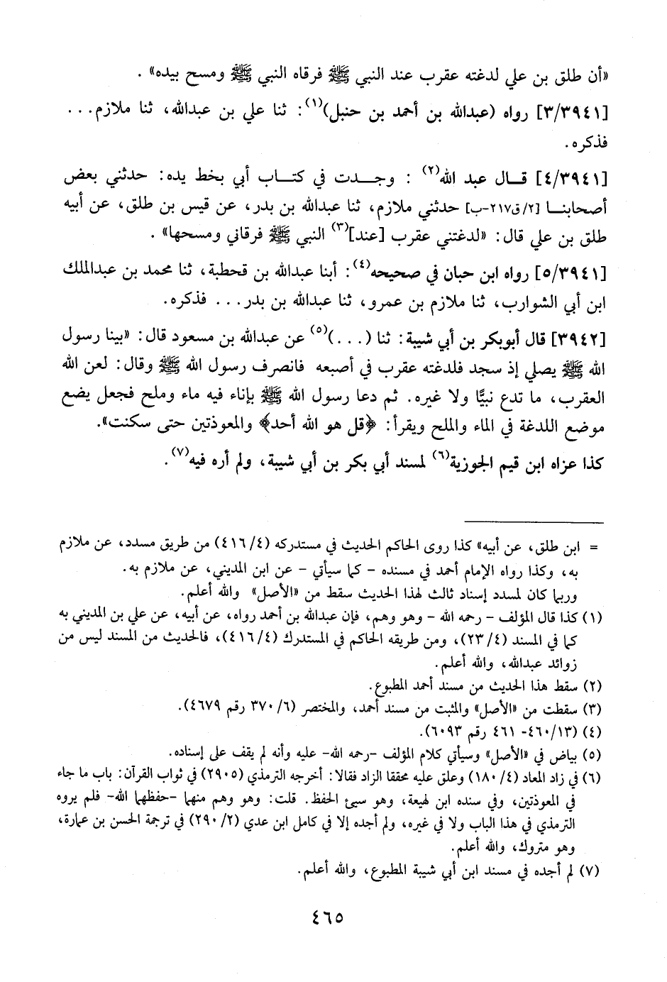 3941 / 4 - قَالَ عَبْدُ اللَّهِ: وَجَدْتُ فِي كِتَابِ أَبِي بخط يده: حدثني بعض أصحابنا [2/ ق 217-ب] حَدَّثَنِي مُلَازِمٌ، ثنا عَبْدُ اللَّهِ بْنُ بَدْرٌ، عَنْ قَيْسِ بْنِ طَلْقٍ، عَنْ أَبِيهِ طَلْقِ بْنِ عَلِيٍّ قَالَ: "لَدَغَتْنِي عَقْرَبٍ [عِنْدَ] النَّبِيِّ - صَلَّى اللَّهُ عَلَيْهِ وَسَلَّمَ - فرقاني ومسحها".