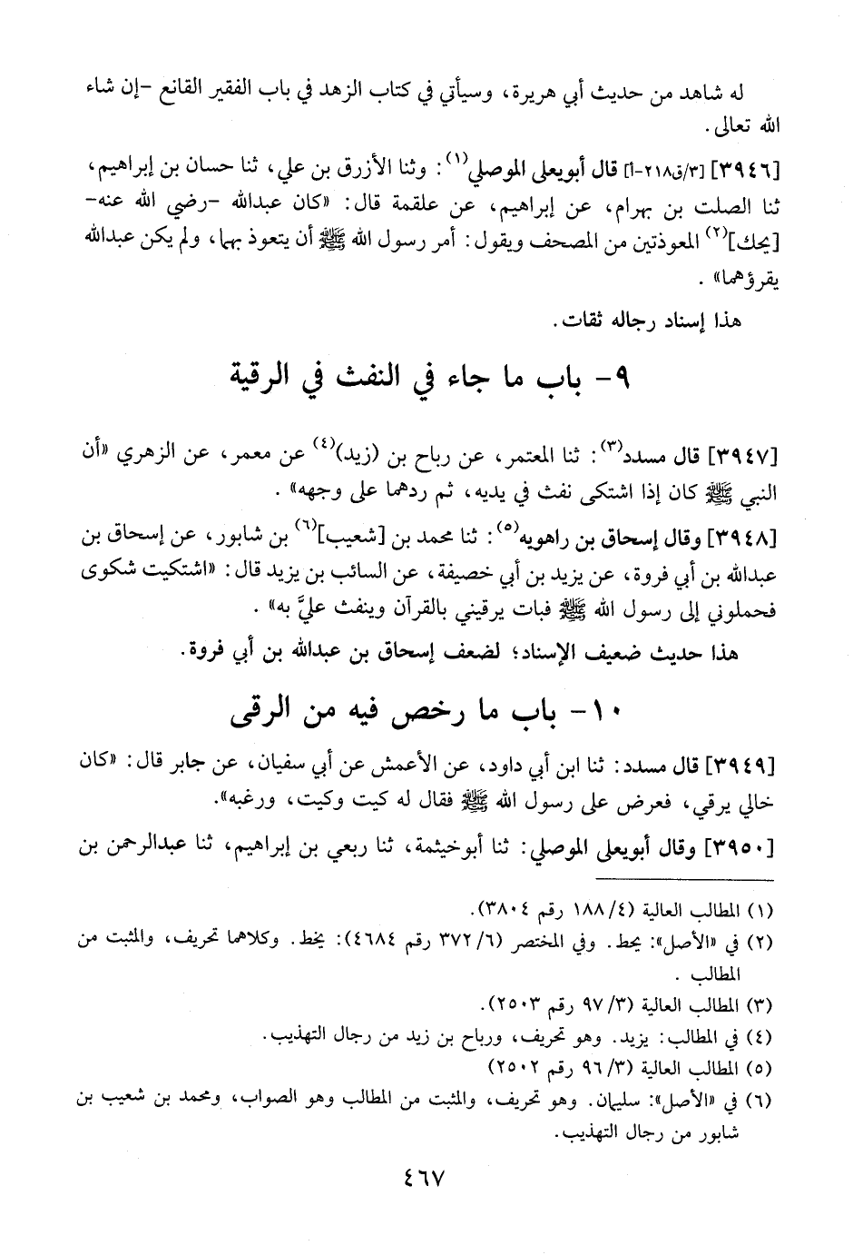 3947 - قَالَ مُسَدَّدٌ: ثنا المعتمر، عن رباح بْنِ (زَيْدٍ) عَنْ مَعْمَرٍ، عَنِ الزُّهْرِيِّ "أَنّ النَّبِيَّ - صَلَّى اللَّهُ عَلَيْهِ وَسَلَّمَ - كَانَ إِذَا اشْتَكَى نَفَثَ فِي يَدَيْهِ، ثُمَّ رَدَّهُمَا عَلَى وَجْهِهِ".