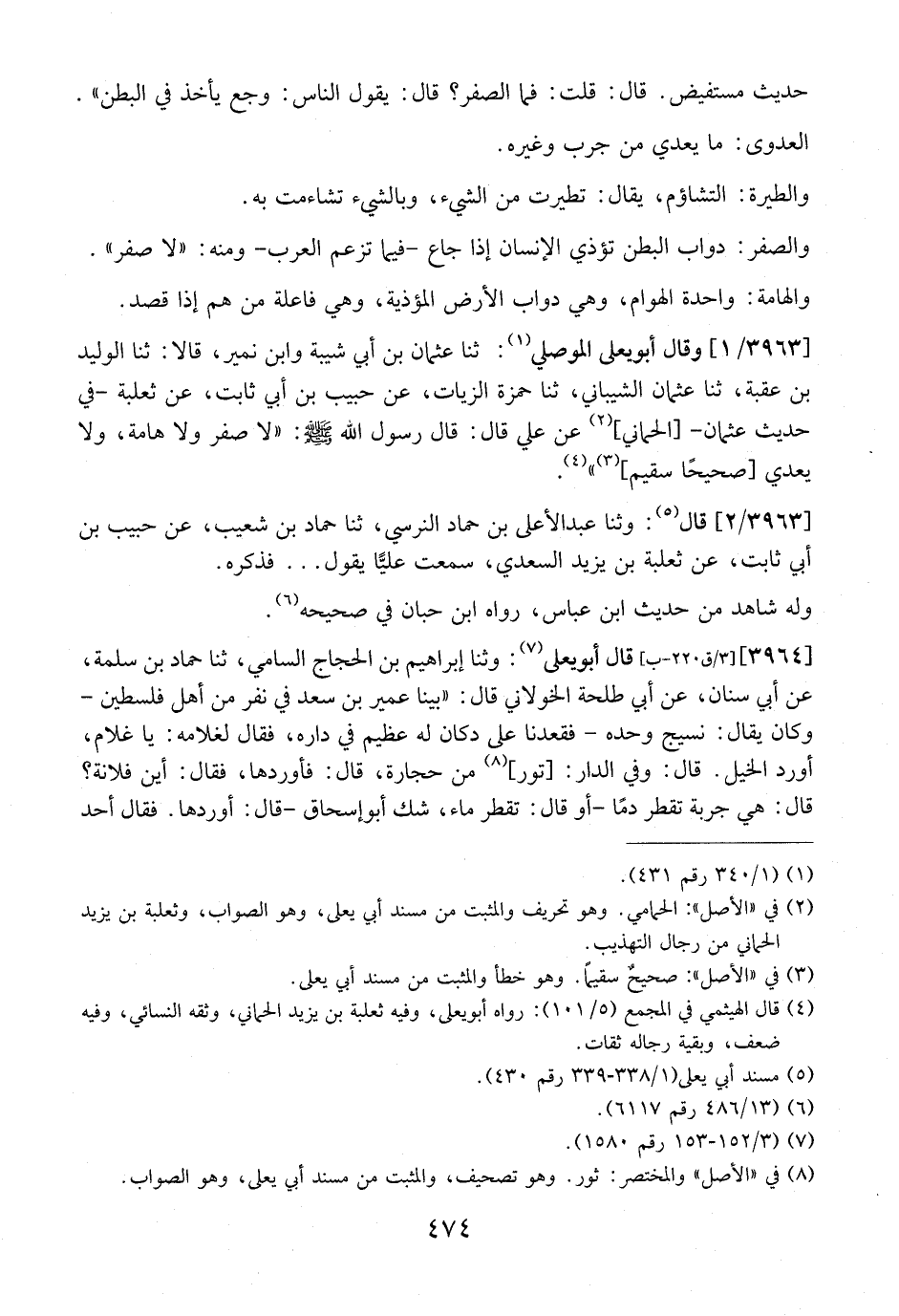 3963 / 1 - وَقَالَ أَبُو يَعْلَى الْمَوْصِلِيُّ: ثَنَا عُثْمَانُ بْنُ أَبِي شَيْبَةَ وَابْنُ نُمَيْرٍ، قَالَا: ثنا الْوَلِيدُ بْنُ عُقْبَةَ، ثنا عُثْمَانُ الشَّيْبَانِيُّ، ثنا حَمْزَةُ الزِّيَّاتُ، عن حبيب بن أبي ثابت، عن ثعلبة -فِي حَدِيثِ عُثْمَانَ-[الْحِمَّانِيِّ] عَنْ عَلِيٍّ قَالَ: قَالَ رَسُولُ اللَّهِ - صَلَّى اللَّهُ عَلَيْهِ وَسَلَّمَ -: "لا صفر وَلَا هَامَّةَ، وَلَا يُعْدِي [صَحِيحًا سَقِيمٌ] ".