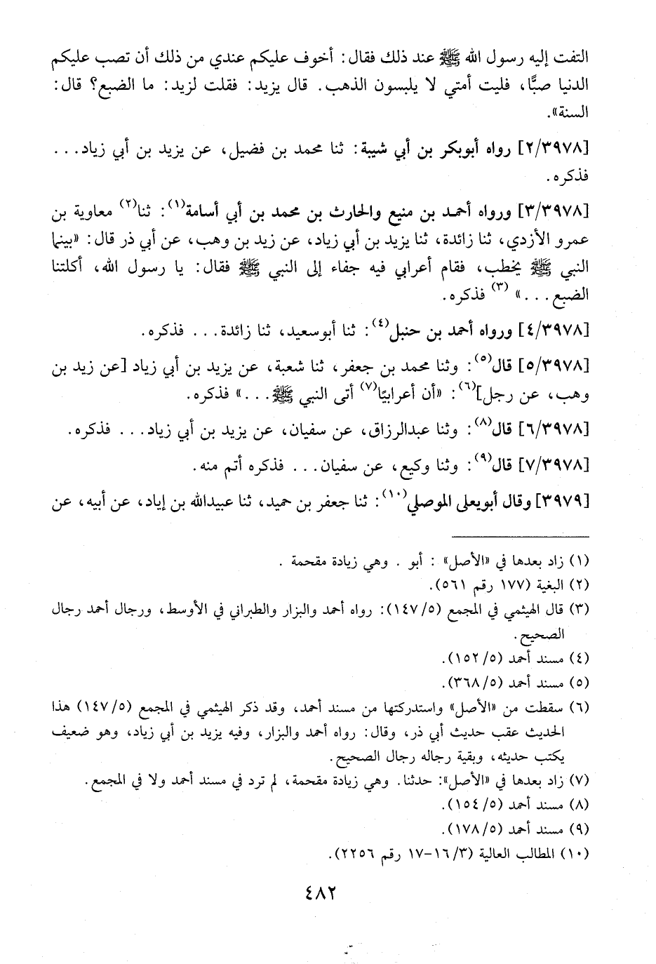 3978 / 3 - وَرَوَاهُ أَحْمَدُ بْنُ مَنِيعٍ وَالْحَارِثُ بْنُ مُحَمَّدِ بْنِ أَبِي أُسَامَةَ: ثَنَا مُعَاوِيَةُ بْنُ عَمْرٍو الْأَزْدِيُّ، ثنا زَائِدَةُ، ثنا يَزِيدُ بْنُ أَبِي زِيَادٍ، عَنْ زَيْدِ بْنِ وَهْبٍ، عَنْ أَبِي ذَرٍّ قَالَ: "بَيْنَمَا النَّبِيُّ - صَلَّى اللَّهُ عَلَيْهِ وَسَلَّمَ - يَخْطُبُ، فَقَامَ أَعْرَابِيٌّ فِيهِ جَفَاءٌ إِلَى النَّبِيِّ - صَلَّى اللَّهُ عَلَيْهِ وَسَلَّمَ - فَقَالَ: يَا رَسُولَ اللَّهِ، أَكَلَتْنَا الضُّبُعُ ... " فَذَكَرَهُ.