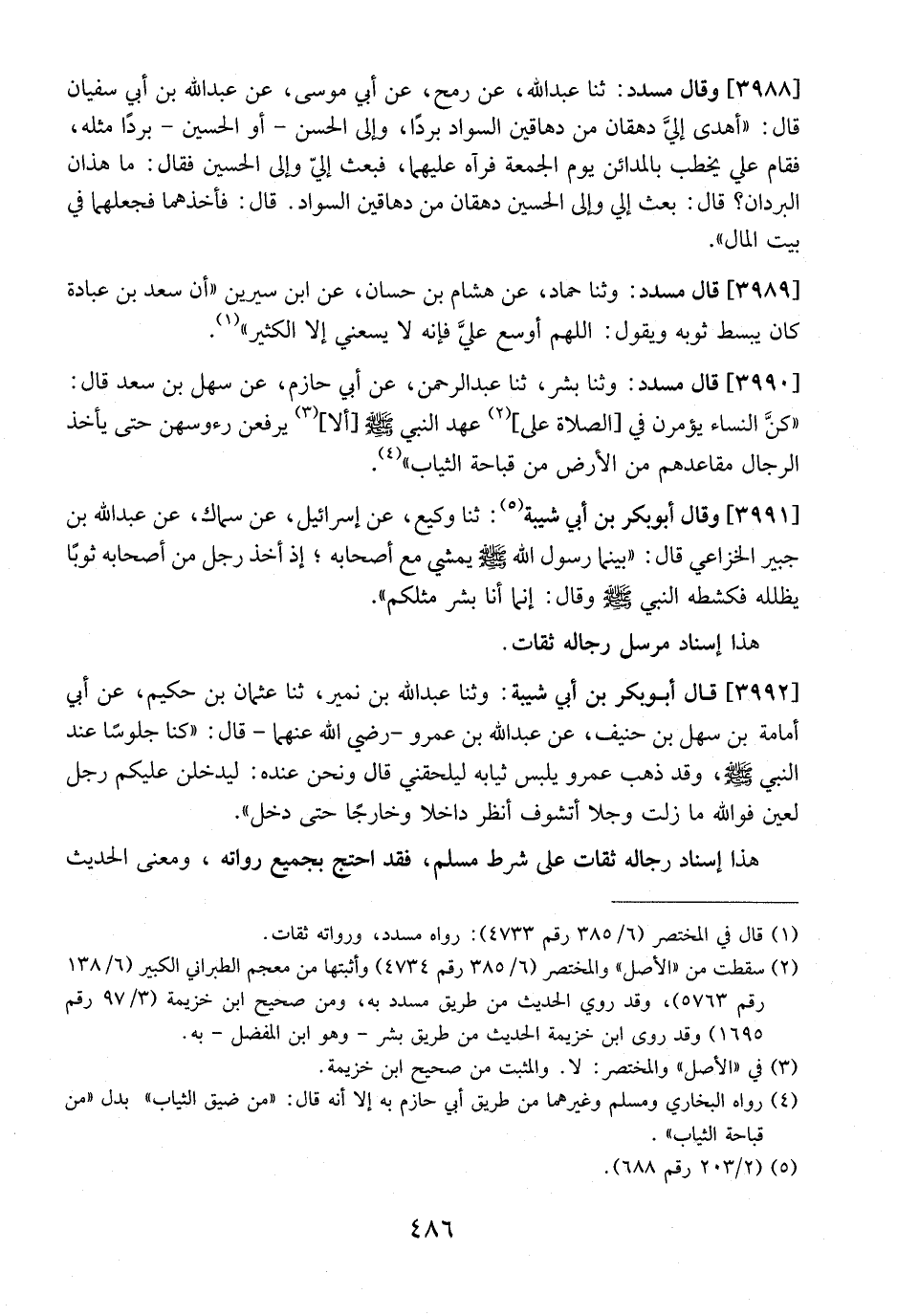 3990 - قَالَ مُسَدَّدٌ: وَثنا بِشْرٌ، ثنا عَبْدُ الرَّحْمَنِ، عَنْ أَبِي حَازِمٍ، عْنَ سْهَلِ بْنِ سْعَدٍ قَالَ: "كنَّ النِّسَاءُ يؤمرن في [الصلاة عَلَى] عَهْدِ النَّبِيِّ - صَلَّى اللَّهُ عَلَيْهِ وَسَلَّمَ -[ألا] يَرْفَعْنَ رُءُوسَهُنَّ حَتَّى يَأْخُذَ الرِّجَالُ مَقَاعِدَهُمْ مِنَ الْأَرْضِ مِنْ قَبَاحَةِ الثِّيَابِ".