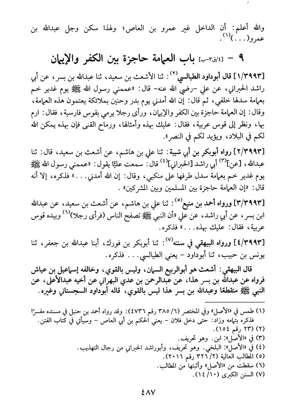 3993 / 1 - قَالَ أَبُو دَاوُدَ الطَّيَالِسِيُّ: ثَنَا الْأَشْعَثُ بْنُ سَعِيدٍ، ثَنَا عَبْدُ اللَّهِ بْنُ بُسْرٍ، عَنْ أَبِي رَاشِدٍ الْحَبْرَانِيِّ، عَنْ عَلَيٍّ - رَضِيَ اللَّهُ عَنْهُ - قَالَ: "عَمَّمَنِي رَسُولَ اللَّهِ - صَلَّى اللَّهُ عَلَيْهِ وَسَلَّمَ - يَوْمَ غَدِيرَ خَمْ بِعِمَامَةٍ سَدَلَهَا خَلْفِي، ثُمَّ قَالَ: إِنَّ اللَّهَ أَمَدَّنِي يَوْمَ بَدْرٍ وَحُنَيْنٍ بِمِلَائِكَةٍ يَعْتَمُّونَ هَذِهِ الْعِمَامَةَ، وَقَالَ: إِنَّ الْعِمَامَةَ حَاجِزَةٌ بَيْنَ الْكُفْرِ وَالْإِيمَانِ، وَرَأَى رَجُلًا يرمي بقوس فارسية، فقالى: ارْمِ بِهَا، وَنَظَرَ إِلَى قَوْسٍ عَرَبِيَّةٍ، فَقَالَ: عَلَيْكَ بِهَذِهِ وَأَمْثَالِهَا، وَرِمَاحِ الْقَنَى فَإِنَّ بِهَذِهِ يُمَكِّنُ اللَّهُ لَكُمْ فِي الْبِلَادِ، وَيُؤَيِّدُ لَكُمْ فِي النَّصْرِ".