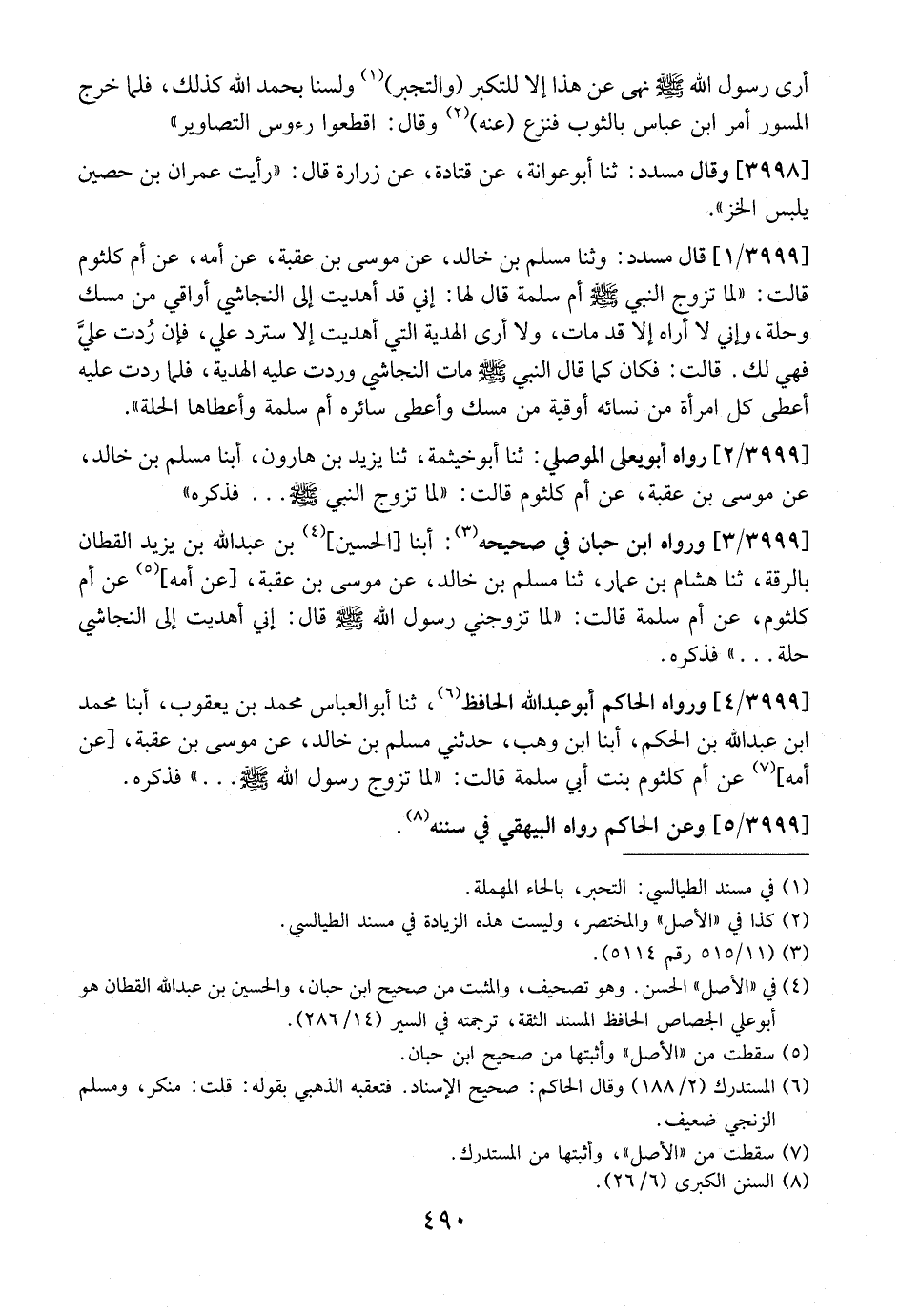 3999 / 1 - قَالَ مُسَدَّدٌ: وَثنا مُسْلِمُ بْنُ خَالِدٍ، عَنْ مُوسَى بْنِ عُقْبَةَ، عَنْ أُمِّهِ، عَنْ أُمِّ كُلْثُومٍ قَالَتْ: "لَمَّا تَزَوَّجَ النَّبِيُّ - صَلَّى اللَّهُ عَلَيْهِ وَسَلَّمَ - أُمَّ سَلَمَةَ قَالَ لَهَا: إِنِّي قَدْ أَهْدَيْتُ إِلَى النَّجَاشِيِّ أَوَاقِيَ مِنْ مِسْكٍ وَحُلَّةً، وَإِنِّي لَا أَرَاهُ إِلَّا قَدْ مَاتَ، وَلَا أَرَى الْهَدِيَّةَ الَّتِي أَهْدَيْتُ إِلَّا سَتُرَدُّ عَلَيَّ، فَإِنْ رُدت عليَّ فَهِيَ لَكِ. قَالَتْ: فَكَانَ كَمَا قَالَ النَّبِيُّ - صَلَّى اللَّهُ عَلَيْهِ وَسَلَّمَ - مَاتَ النَّجَاشِيُّ وَرُدَّتْ عَلَيْهِ الْهَدِيَّةُ، فَلَمَّا رُدَّتْ عَلَيْهِ أَعْطَى كُلَّ امْرَأَةٍ مِنْ نِسَائِهِ أُوقِيَّةً مِنْ مِسْكٍ وَأَعْطَى سَائِرَهُ أُمَّ سَلَمَةَ وَأَعْطَاهَا الْحُلَّةَ".