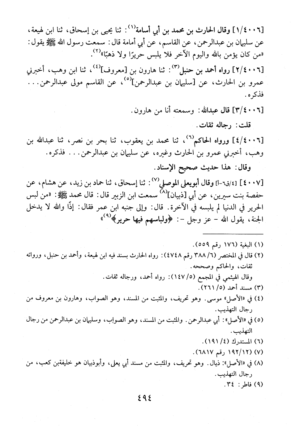 4006 / 1 - وَقَالَ الْحَارِثُ بْنُ مُحَمَّدِ بْنِ أَبِي أُسَامَةَ: ثنا يَحْيَى بْنُ إِسْحَاقَ، ثَنَا ابْنُ لَهِيعَةَ، عَنْ سُلَيْمَانَ بْنِ عَبْدِ الرَّحْمَنِ، عَنِ الْقَاسِمِ، عَنْ أَبِي أُمَامَةَ قَالَ: سَمِعْتُ رَسُولَ اللَّهِ - صَلَّى اللَّهُ عَلَيْهِ وَسَلَّمَ - يَقُولُ: "مَنْ كَانَ يُؤْمِنُ بِاللَّهِ وَالْيَوْمِ الْآخِرِ فَلَا يَلْبَسَ حَرِيرًا وَلَا ذَهَبًا".