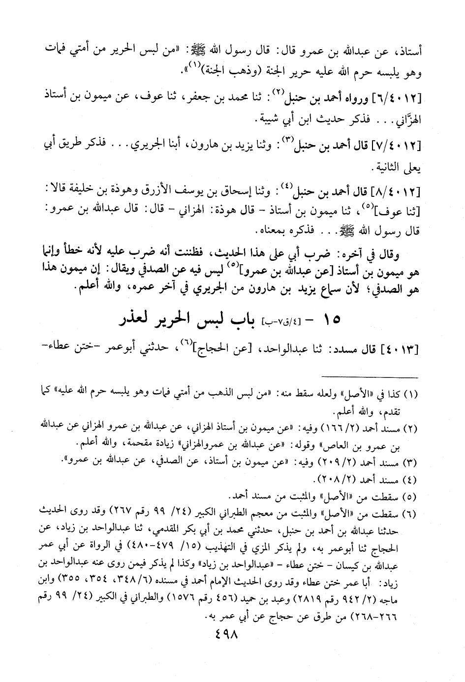 أُسْتَاذٍ، عَنْ عَبْدِ اللَّهِ بْنِ عَمْرٍو قَالَ: قَالَ رَسُولُ اللَّهِ - صَلَّى اللَّهُ عَلَيْهِ وَسَلَّمَ -: "مَنْ لَبِسَ الْحَرِيرَ مِنْ أُمَّتِي فَمَاتَ وَهُوَ يَلْبَسُهُ حَرَّمَ اللَّهُ عَلَيْهِ حَرِيرَ الْجَنَّةِ (وَذَهَبَ الْجَنَّةِ) ".