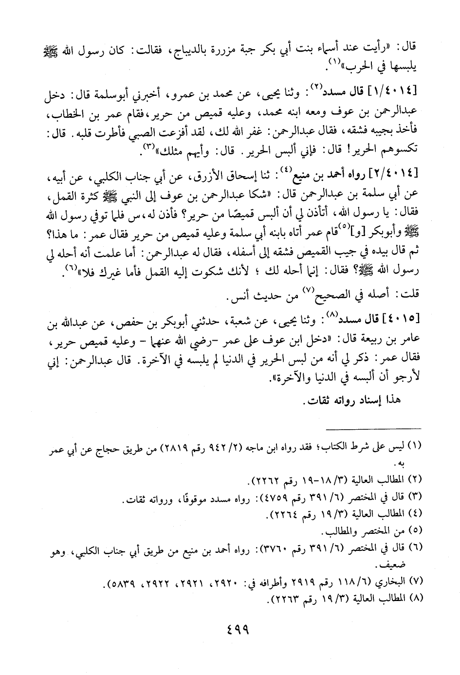4015 - قَالَ مُسَدَّدٌ: وثنا يَحْيَى، عَنْ شُعْبَةَ، حَدَّثَنِي أَبُو بَكْرِ بْنُ حَفْصٍ، عَنْ عَبْدِ اللَّهِ بْنِ عَامِرِ بْنِ رَبِيعَةَ قَالَ: "دَخَلَ ابْنُ عَوْفٍ عَلَى عُمَرَ - رَضِيَ اللَّهُ عَنْهُمَا - وَعَلَيْهِ قَمِيصٌ حَرِيرٌ، فَقَالَ عُمَرُ: ذُكِرَ لِي أَنَّهُ مَنْ لَبِسَ الْحَرِيرَ فِي الدُّنْيَا لَمْ يَلْبَسْهُ فِي الْآخِرَةِ. قَالَ عَبْدُ الرَّحْمَنِ: إِنِّي لَأَرْجُو أَنْ أَلْبَسَهُ فِي الدنيا والآخرة".