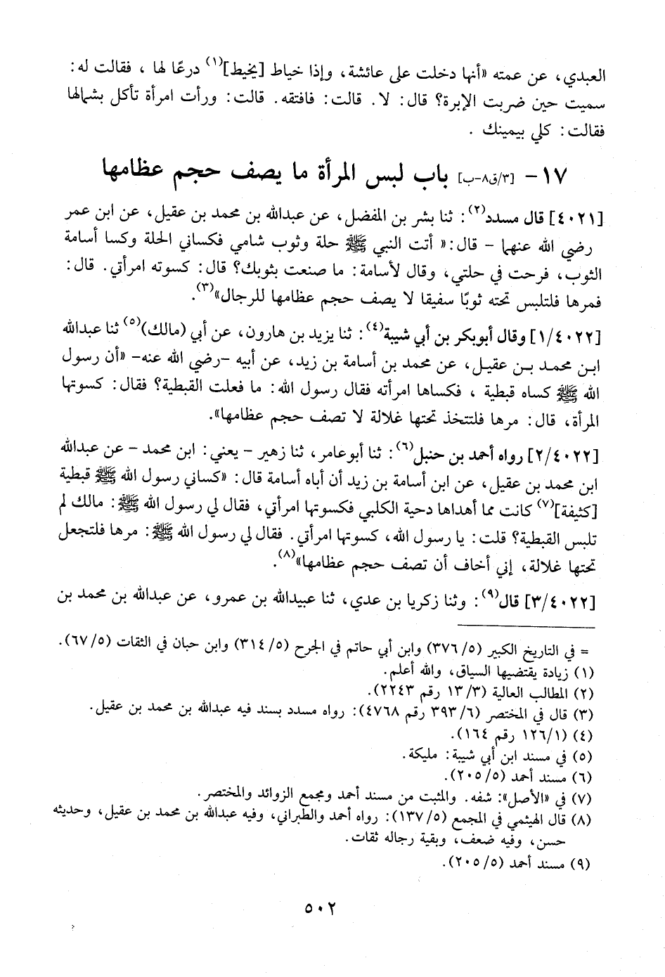 4021 - قَالَ مُسَدَّدٌ: ثَنَا بِشْرُ بْنُ الْمُفَضَّلِ، عَنْ عَبْدِ اللَّهِ بْنِ مُحَمَّدِ بْنِ عُقَيْلٍ، عَنْ ابْنِ عُمَرَ - رَضِيَ اللَّهُ عَنْهُمَا - قَالَ: "أَتَتِ النَّبِيَّ - صَلَّى اللَّهُ عَلَيْهِ وَسَلَّمَ - حُلَّةٌ وَثَوْبٌ شَامِيٌّ فَكَسَانِيَ الْحُلَّةَ وَكَسَا أُسَامَةَ الثَّوْبَ، فَرُحْتُ فِي حُلَّتِي، وَقَالَ لِأُسَامَةَ: مَا صَنَعْتَ بِثَوْبِكَ؟ قال: كسوته امرأتي. قال: فمرها فلتلبس تحته ثوبًا سفيقا لَا يَصِفُ حَجْمَ عِظَامِهَا لِلرِّجَالِ".