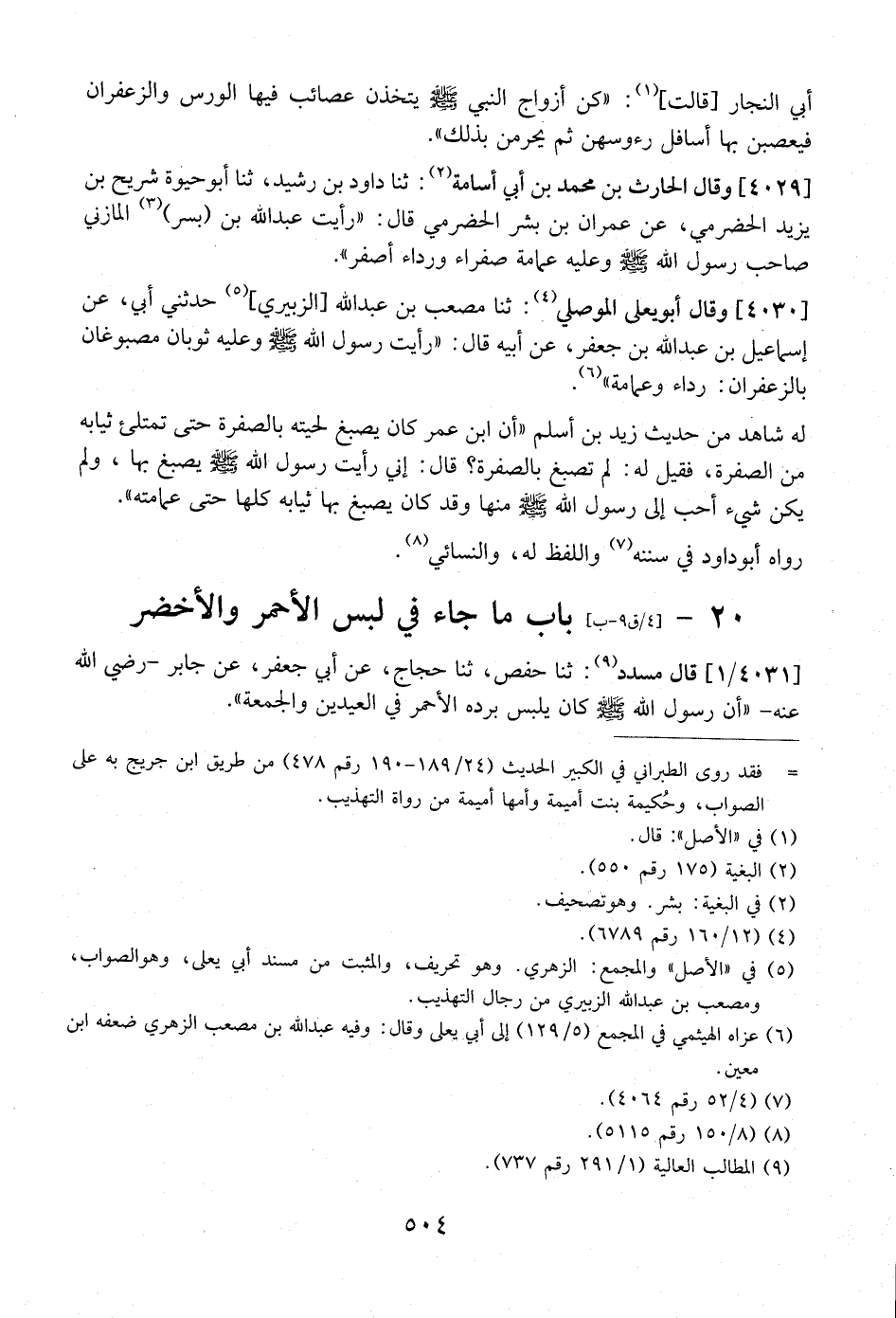 4030 - وَقَالَ أَبُو يَعْلَى الْمَوْصِلِيُّ: ثنا مُصْعَبُ بْنُ عَبْدِ الله [الزبيري] حَدَّثَنِي أَبِي، عَنْ إِسْمَاعِيلَ بْنِ عَبْدِ اللَّهِ بْنِ جَعْفَرٍ، عَنْ أَبِيهِ قَالَ: "رَأَيْتُ رَسُولَ اللَّهِ - صَلَّى اللَّهُ عَلَيْهِ وَسَلَّمَ - وَعَلَيْهِ ثَوْبَانِ مَصْبُوغَانِ بِالزَّعْفَرَانِ: رِدَاءٌ وَعِمَامَةٌ".