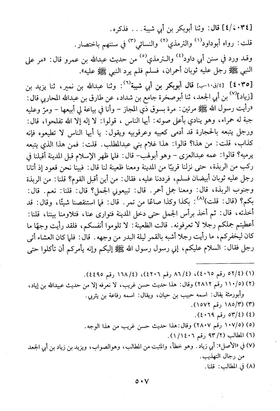 4035 -[4/ ق 10-ب] قَالَ أَبُو بَكْرِ بْنُ أَبِي شَيْبَةَ: وَثَنَا عَبْدُ اللَّهِ بْنُ نُمَيْرٍ، ثنا يَزِيدُ بْنُ [زِيَادِ] بْنِ أَبِي الْجَعْدِ، ثنا أَبُو صَخْرَةَ جَامِعُ بْنُ شَدَّادٍ، عَنْ طَارِقِ بْنِ عَبْدِ اللَّهِ الْمُحَارِبِي قَالَ: "رَأَيْتُ رَسُولَ اللَّهِ - صَلَّى اللَّهُ عَلَيْهِ وَسَلَّمَ - مَرَّتَيْنِ: مَرَّةً بِسُوقِ ذِي الْمُجَازِ -وَأَنَا في بياعة لي أبيعها- ومرّ وَعَلَيْهِ جُبَّةٌ لَهُ حَمْرَاءُ، وَهُوَ يُنَادِي بِأَعْلَى صَوْتِهِ: أَيُهَّا النَّاسُ، قُولُوا: لَا إِلَهَ إِلَّا اللَّهُ تُفْلِحُوا، قَالَ: وَرَجُلٌ يَتْبَعُهُ بِالْحِجَارَةِ قَدْ أَدْمَى كعبيه وعرقوبيه ويقول: يَا أَيُّهَا النَّاسُ لَا تُطِيعُوهُ فَإِنَّهُ كَذَّابٌ، قُلْتُ: مَنْ هَذَا؟ قَالُوا: هَذَا غُلَامُ بَنِي عَبْدِ الْمُطَّلِبِ. قُلْتُ: فَمَنْ هَذَا الَّذِي يَتْبَعُهُ يَرْمِيهِ؟ قَالُوا: عَمُّهُ عَبْدُ الْعُزَّى -وَهُوَ أَبُو لَهَبٍ- قَالَ: فَلَمَّا ظَهَرَ الْإِسْلَامُ قِبَلَ الْمَدِينَةِ أَقْبَلَنْا فِي رَكْبٍ مِنَ الرَّبَذَةِ، حَتَّى نَزَلْنَا قَرِيبًا مِنَ الْمَدِينَةِ وَمَعَنَا ظَعِينَةٌ لَنَا قَالَ: فَبَيْنَا نَحْنُ قُعُودٌ إِذَ أَتَانَا رَجُلٌ عَلَيْهِ ثَوْبَانِ أَبْيَضَانِ فَسَلَّمَ، فَرَدَدْنَا عَلَيْهِ، فَقَالَ: مِنْ أَيْنَ أَقْبَلَ الْقَوْمُ؟ قُلْنَا: مِنَ الربذة وجنوب الرَّبَذَةِ، قَالَ: وَمَعَنَا جَمَلٌ أَحْمَرُ. قَالَ: تَبِيعُونِي الْجَمَلَ؟ قَالَ: قُلْنَا: نَعَمْ. قَالَ: بِكَمْ؟ (قَالَ: قُلْتُ) : بِكَذَا وَكَذَا صَاعًا مِنْ تَمْرٍ. قَالَ: فَمَا اسْتَنْقَصَنَا شَيْئًا، وَقَالَ: قَدْ أَخَذْتُهُ، قَالَ: ثُمَّ أَخَذَ بِرَأْسِ الْجَمَلِ حَتَّى دَخَلَ الْمَدِينَةَ فَتَوَارَى عَنَّا، فَتَلَاوَمْنَا بَيْنَنَا، قُلْنَا: أَعَطَيْتُمْ جَمَلَكُمْ رَجُلًا لَا تَعْرِفُونَهُ. قَالَتِ الظَّعِينَةُ: لَا تَلُومُوا أَنْفُسَكُمْ، فَلَقَدْ رَأَيْتُ وَجْهًا مَا كَانَ لِيَخْفِرَكُمْ، مَا رَأَيْتُ رَجُلًا أَشْبَهُ بِالْقَمَرِ لَيْلَةَ الْبَدْرِ مِنْ وَجْهِهِ. قَالَ: فَلَمَّا كَانَ الْعَشَاءُ أَتَى رَجُلٌ فَقَالَ: السَّلَامُ عَلَيْكُمْ، إِنِّي رَسُولُ رَسُولِ اللَّهِ - صَلَّى اللَّهُ عَلَيْهِ وَسَلَّمَ - إِلَيْكُمْ وَإِنَّهُ يَأْمُرُكُمْ أَنْ تَأْكُلُوا حَتَّى
