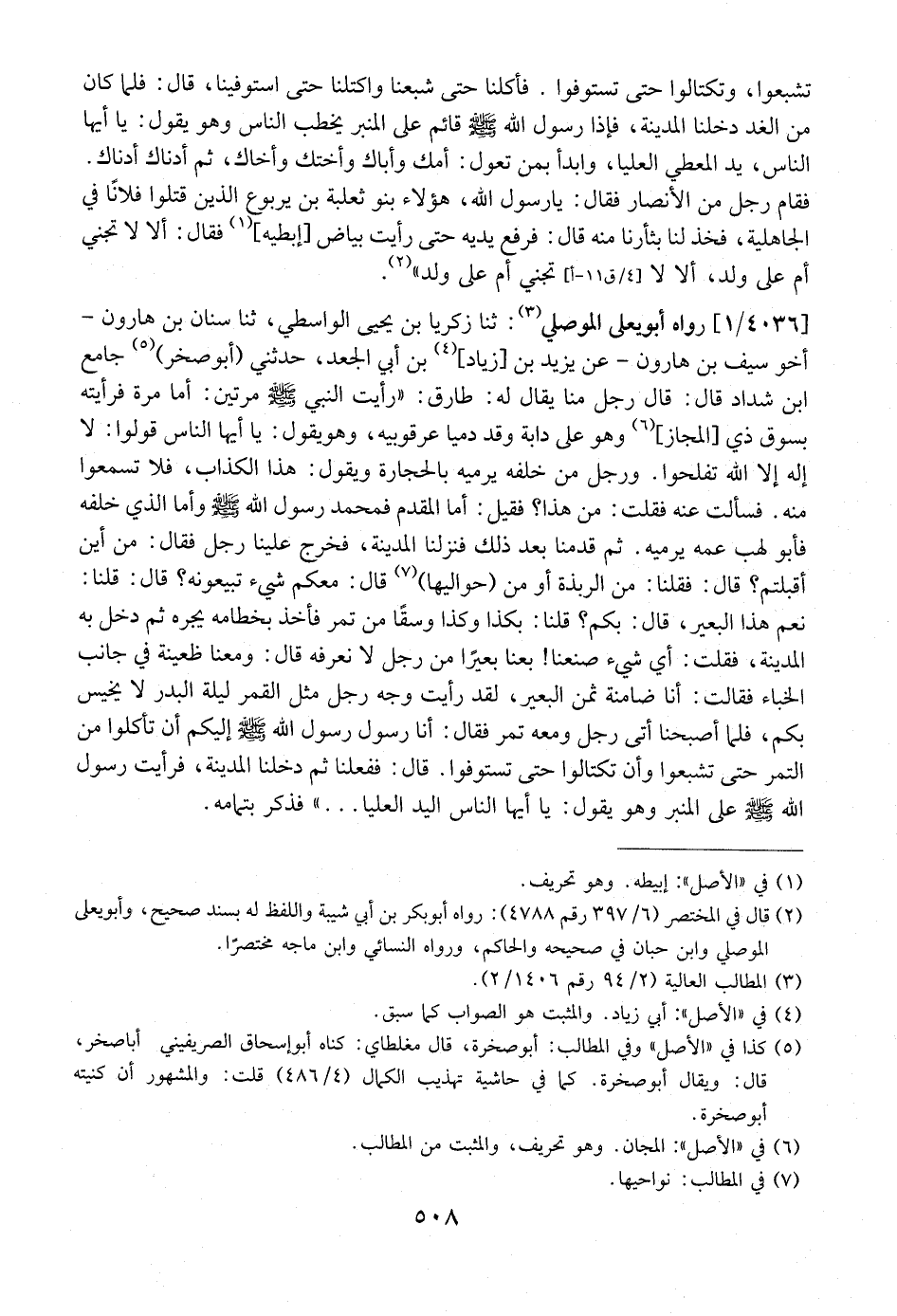 4036 / 1 - رَوَاهُ أَبُو يَعْلَى الْمَوْصِلِيُّ: ثنا زَكَرِيَّا بْنُ يَحْيَى الْوَاسِطِيُّ، ثنا سِنَانُ بْنُ هَارُونَ -أَخُو سَيْفِ بْنِ هَارُونَ- عَنْ يزيد بن [زِيَادِ] بْنِ أَبِي الْجَعْدِ، حَدَّثَنِي (أَبُو صَخْرٍ) جامع ابن شَدَّادٍ قَالَ: قَالَ رَجُلٌ مِنَّا يُقَالُ لَهُ: طَارِقٌ: "رَأَيْتُ النَّبِيَّ - صَلَّى اللَّهُ عَلَيْهِ وَسَلَّمَ - مَرَّتَيْنِ: أَمَّا مَرَّةٌ فَرَأَيْتُهُ بِسُوقِ ذِي [الْمَجَازِ] وَهُوَ عَلَى دَابَّةٍ وَقَدْ دَمِيَا عَرْقُوبَيْهِ، وَهُوَ يَقُولُ: يَا أَيُّهَا النَّاسُ قُولُوا: لَا إِلَهَ إِلَّا اللَّهُ تُفْلِحُوا. وَرَجُلٌ مِنْ خَلْفِهِ يَرْمِيهِ بِالْحِجَارَةِ وَيَقُولُ: هَذَا الْكَذَّابُ، فَلَا تَسْمَعُوا مِنْهُ. فَسَأَلْتُ عَنْهُ فَقُلْتُ: مَنْ هَذَا؟ فَقِيلَ: أَمَّا الْمُقَدَّمُ فَمُحَمَّدٌ رَسُولُ اللَّهِ - صَلَّى اللَّهُ عَلَيْهِ وَسَلَّمَ - وَأَمَّا الَّذِي خَلْفَهُ فَأَبُو لَهَبٍ عَمُّهُ يَرْمِيهِ. ثُمَّ قَدِمْنَا بَعْدَ ذَلِكَ فَنَزَلْنَا الْمَدِينَةَ، فَخَرَجَ عَلَيْنَا رَجُلٌ فَقَالَ: مِنْ أَيْنَ أَقْبَلْتُمْ؟ قال: فقلنا: مِنَ الرَّبَذَةِ أَوْ مِنْ (حَوَالَيْهَا) قَالَ: مَعَكُمْ شَيْءٌ تَبِيعُونَهُ؟ قَالَ: قُلْنَا: نَعَمْ هَذَا الْبَعِيرُ، قَالَ: بِكَمْ؟ قُلْنَا: بِكَذَا وَكَذَا وَسَقًا مِنْ تَمْرٍ فَأَخَذَ بِخُطَامِهِ يَجُرُّهُ ثُمَّ دَخَلَ بِهِ الْمَدِينَةَ، فَقُلْتُ: أَيُّ شَيْءٍ صَنَعْنَا! بِعْنَا بَعِيرًا مِنْ رَجُلٍ لَا نَعْرِفُهُ قَالَ: وَمَعَنَا ظَعِينَةٌ فِي جَانِبِ الْخِبَاءِ فَقَالَتْ: أَنَا ضَامِنَةٌ ثَمَنَ الْبَعِيرِ، لَقَدْ رَأَيْتُ وَجْهَ رَجُلٍ مِثْلَ الْقَمَرِ لَيْلَةَ الْبَدْرِ لَا يَخِيسُ بِكُمْ، فَلَمَّا أَصْبَحْنَا أَتَى رَجُلٌ وَمَعَهُ تَمْرٌ فَقَالَ: أَنَا رَسُولُ رَسُولِ اللَّهِ - صَلَّى اللَّهُ عَلَيْهِ وَسَلَّمَ - إِلَيْكُمْ أَنْ تَأْكُلُوا مِنَ التَّمْرِ حَتَّى تَشْبَعُوا وَأَنْ تَكْتَالُوا حَتَّى تَسْتَوْفُوا. قَالَ: فَفَعَلْنَا ثُمَّ دَخَلْنَا الْمَدِينَةَ، فَرَأَيْتُ رَسُولَ اللَّهِ - صَلَّى اللَّهُ عَلَيْهِ وَسَلَّمَ - عَلَى الْمِنْبَرِ وَهُوَ يَقُولُ: يَا أَيُّهَا الناس اليد العليا ... " فذكر بتمامه.