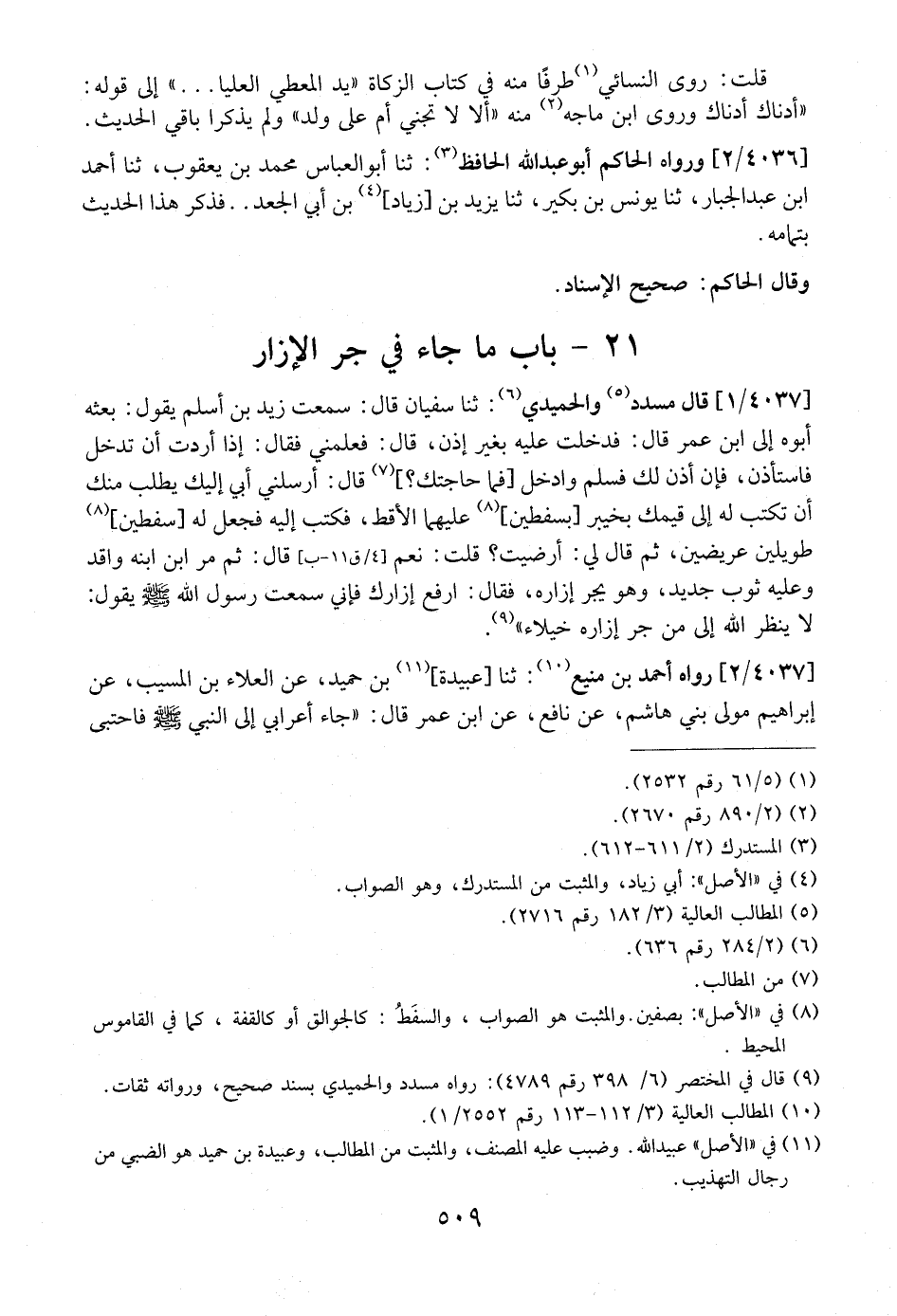 4037 / 1 - قَالَ مُسَدَّدٌ وَالْحُمَيْدِيُّ: ثنا سُفْيَانُ قَالَ: سَمِعْتُ زَيْدَ بْنَ أَسْلَمَ يَقُولُ: بَعَثَهُ أَبُوهُ إِلَى ابْنِ عُمَرَ قَالَ: فَدَخَلْتُ عَلَيْهِ بِغَيْرِ إِذْنٍ، قَالَ: فَعَلَّمَنِي فَقَالَ: إِذَا أَرَدْتَ أَنْ تَدْخُلَ فَاسْتَأْذِنْ، فإن أذن لك فسلم وادخل [فما حاجتك؟] قَالَ: أَرْسَلَنِي أَبِي إِلَيْكَ يَطْلُبُ مِنْكَ أَنْ تكتب له إلى قيمك بخيبر [بسفطين] عليهما الأقط، فكتب إليه فجعل له [سفطين] طَوِيلَيْنِ عَرِيضَيْنِ، ثُمَّ قَالَ لِي: أَرَضِيتَ؟ قُلْتُ: نعم [4/ ق 11-ب] قَالَ: ثُمَّ مَرَّ ابْنُ ابْنِهِ وَاقِدٌ وَعَلَيْهِ ثَوْبٌ جَدِيدٌ، وَهُوَ يَجُرُّ إِزَارَهَ، فَقَالَ: ارْفَعْ إِزَارَكَ فَإِنِّي سَمِعْتُ رَسُولَ اللَّهِ - صَلَّى اللَّهُ عَلَيْهِ وَسَلَّمَ - يَقُولُ: لَا يَنْظُرُ اللَّهُ إِلَى مَنْ جَرَّ إِزَارَهُ خُيَلَاءَ".