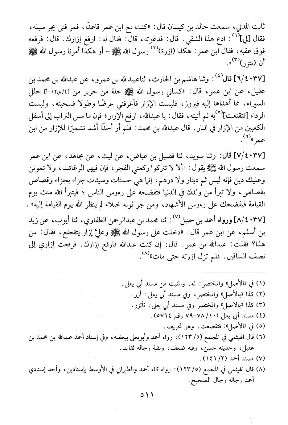 4037 / 8 - وَرَوَاهُ أَحْمَدُ بْنُ حَنْبَلٍ: ثَنَا مُحَمَّدُ بْنُ عَبْدِ الرَّحْمَنِ الطَّفَاوِيُّ، ثنا أَيُّوبُ، عَنْ زَيْدِ بْنِ أَسْلَمَ، عَنِ ابْنِ عُمَرَ قَالَ: "دَخَلْتُ عَلَى رَسُولِ اللَّهِ - صَلَّى اللَّهُ عَلَيْهِ وَسَلَّمَ - وعليَّ إِزَارٌ يَتَقَعْقَعُ، فَقَالَ: مَنْ هَذَا؟ فَقُلْتُ: عَبْدُ اللَّهِ بْنُ عُمَرَ. قَالَ: إِنْ كُنْتَ عَبْدَ اللَّهِ فَارْفَعْ إِزَارَكَ. فَرَفَعْتُ إِزَارِي إِلَى نِصْفِ السَّاقَيْنِ. فَلَمْ تَزَلْ إِزْرَتُهُ حَتَّى مَاتَ".