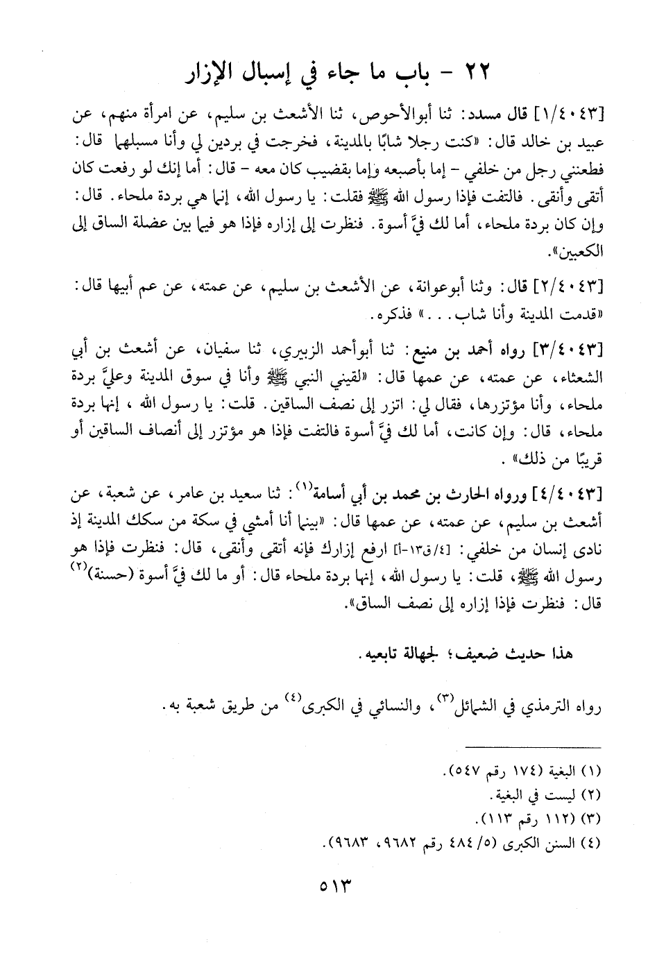 4043 / 4 - وَرَوَاهُ الْحَارِثُ بْنُ مُحَمَّدِ بْنِ أَبِي أُسَامَةَ: ثنا سَعِيدُ بْنُ عَامِرٍ، عَنْ شُعْبَةَ، عَنْ أَشْعَثَ بْنِ سُلَيْمٍ، عَنْ عَمَّتِهِ، عَنْ عَمِّهَا قَالَ: "بَيْنَمَا أَنَا أَمْشِي فِي سِكَّةٍ مِنْ سِكَكِ الْمَدِينَةِ إِذْ نَادَى إِنْسَانٌ مِنْ خَلْفِي: [4/ ق 13-أ] ارفع إزارك فإنه أتقى وأنقى، قَالَ: فَنَظَرْتُ فَإِذَا هُوَ رَسُولُ اللَّهِ - صَلَّى اللَّهُ عَلَيْهِ وَسَلَّمَ -، قُلْتُ: يَا رَسُولَ اللَّهِ، إِنَّهَا بُرْدَةٌ مَلْحَاءُ قَالَ: أَوَ مَا لَكَ فيَّ أُسْوَةٌ (حَسَنَةٌ) قَالَ: فَنَظَرْتُ فَإِذَا إِزَارُهُ إِلَى نِصْفِ السَّاقِ".