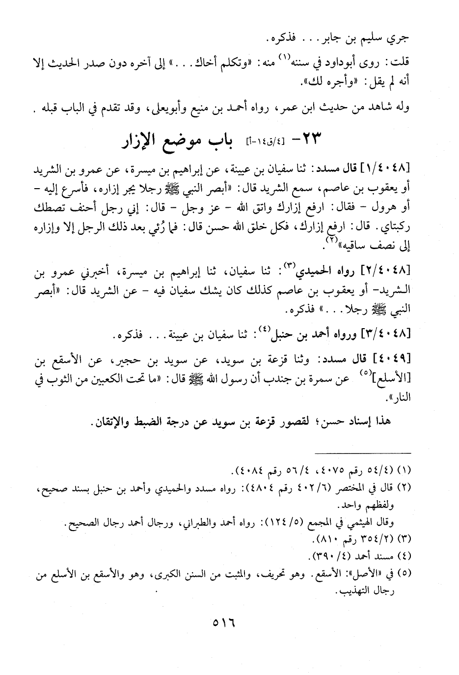 4048 / 1 - قَالَ مُسَدَّدٌ: ثَنَا سُفْيَانُ بْنُ عُيَيْنَةَ، عَنْ إِبْرَاهِيمَ بْنِ مَيْسَرَةَ، عَنْ عَمْرِو بْنِ الشَّرِيدِ أَوْ يَعْقُوبَ بْنِ عَاصِمٍ، سَمِعَ الشَّرِيدُ قَالَ: "أَبْصَرَ النَّبِيُّ - صَلَّى اللَّهُ عَلَيْهِ وَسَلَّمَ - رَجُلًا يَجُرُّ إِزَارَهَ، فَأَسْرَعَ إِلَيْهِ -أَوْ هَرْوَلَ- فَقَالَ: ارْفَعْ إِزَارَكَ وَاتَّقِ اللَّهَ -عَزَّ وَجَلَّ- قَالَ: إِنِّي رَجُلٌ أَحْنَفٌ تَصْطَكُّ رُكْبَتَايَ. قَالَ: ارْفَعْ إِزَارَكَ، فَكُلُّ خَلْقِ اللَّهِ حسن قال: فما رُئي بَعْدَ ذَلِكَ الرَّجُلُ إِلَّا وَإِزَارُهُ إِلَى نِصْفِ سَاقَيْهِ".